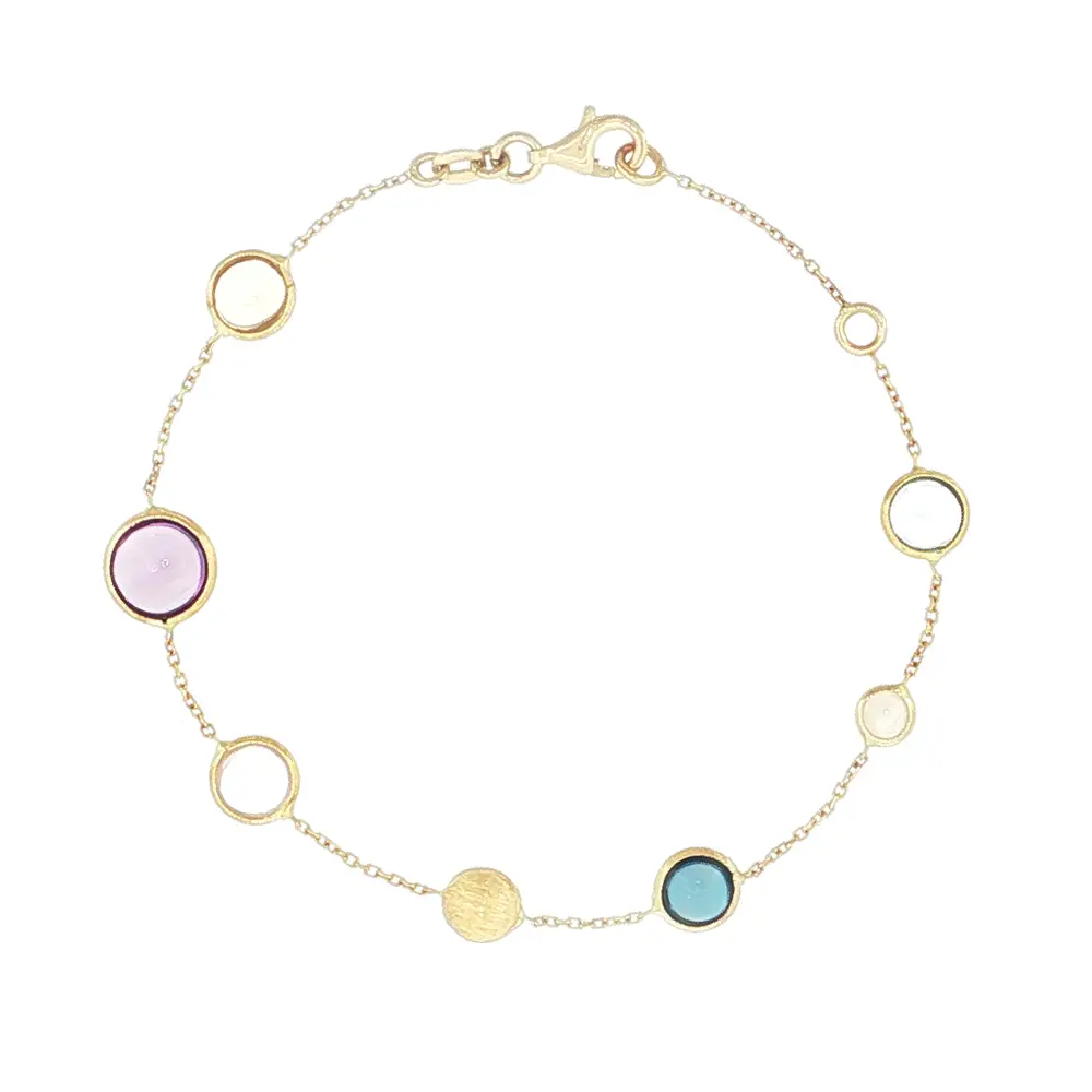 手链采用高品质**14K黄金(585)**制成,耐用且光泽持久。17–19厘米可调节长度,佩戴舒适贴合。金色与彩色宝石的结合带来清新现代的风格。