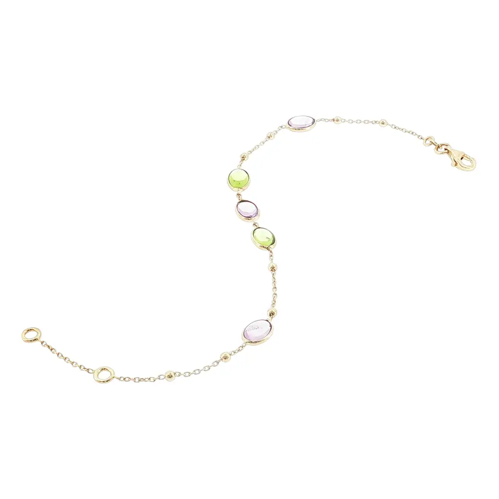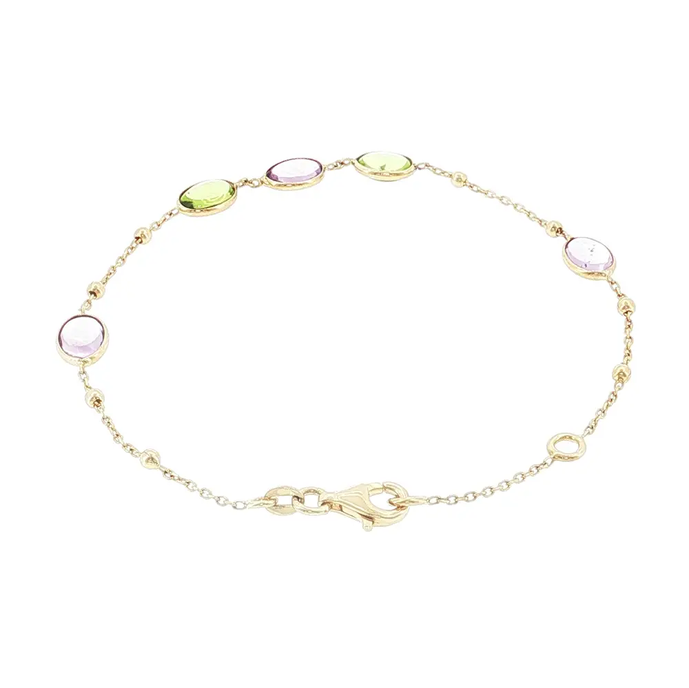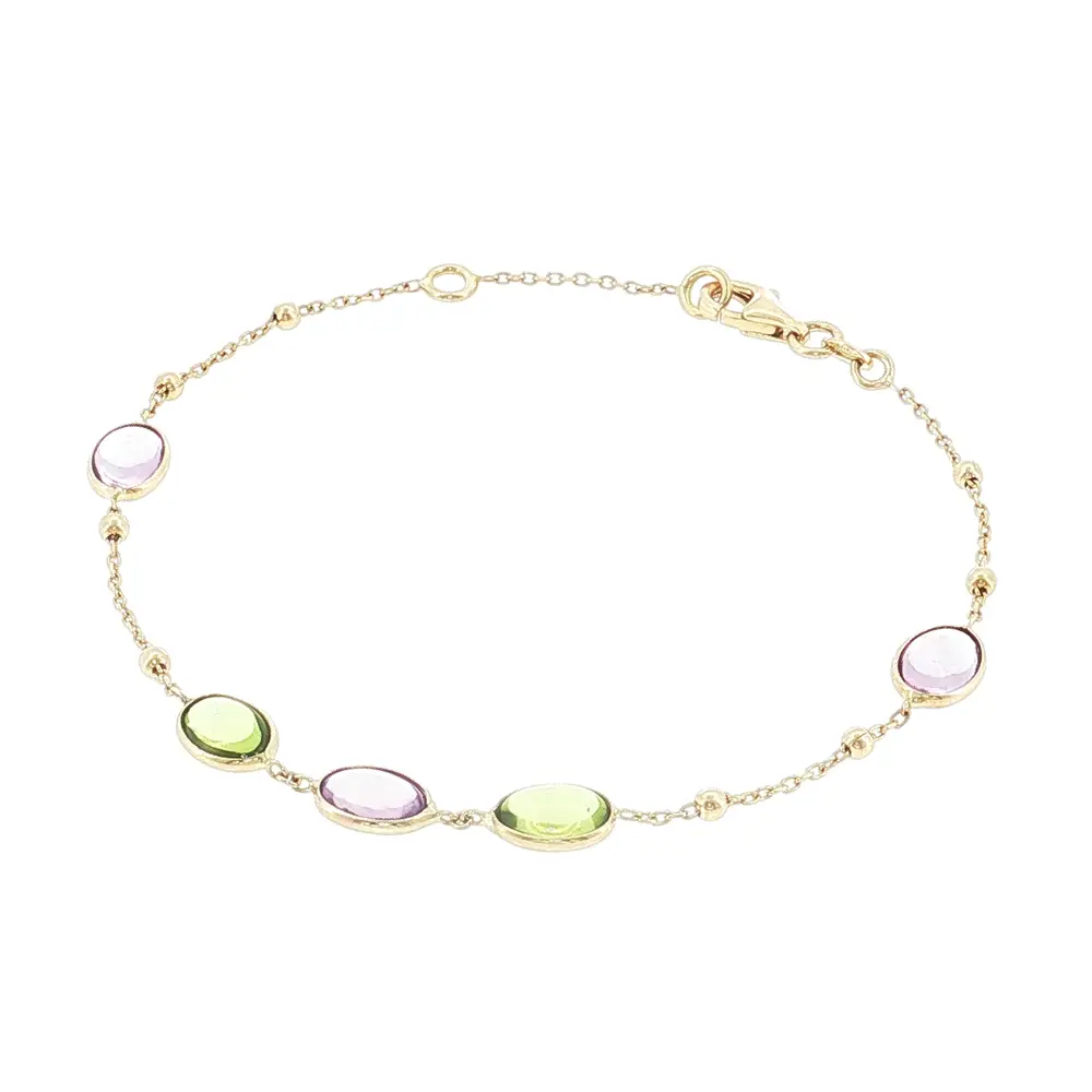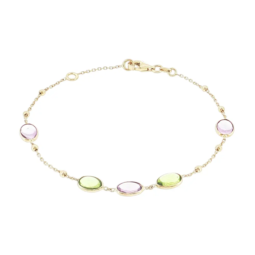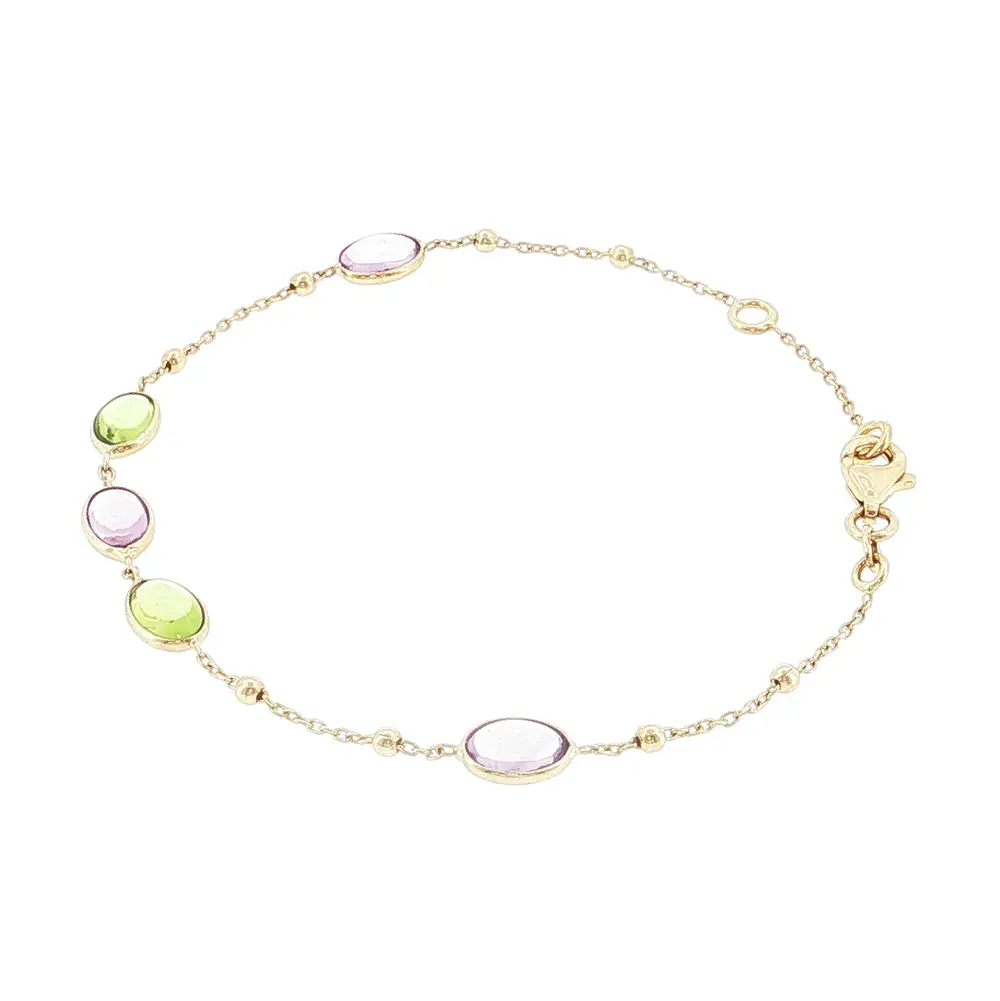 优雅的14K黄金手链采用精致链条设计,风格现代且富有活力。手链点缀有5颗彩色宝石,并搭配小巧的金珠,呈现清新而经典的外观,适合日常佩戴及特殊场合。
