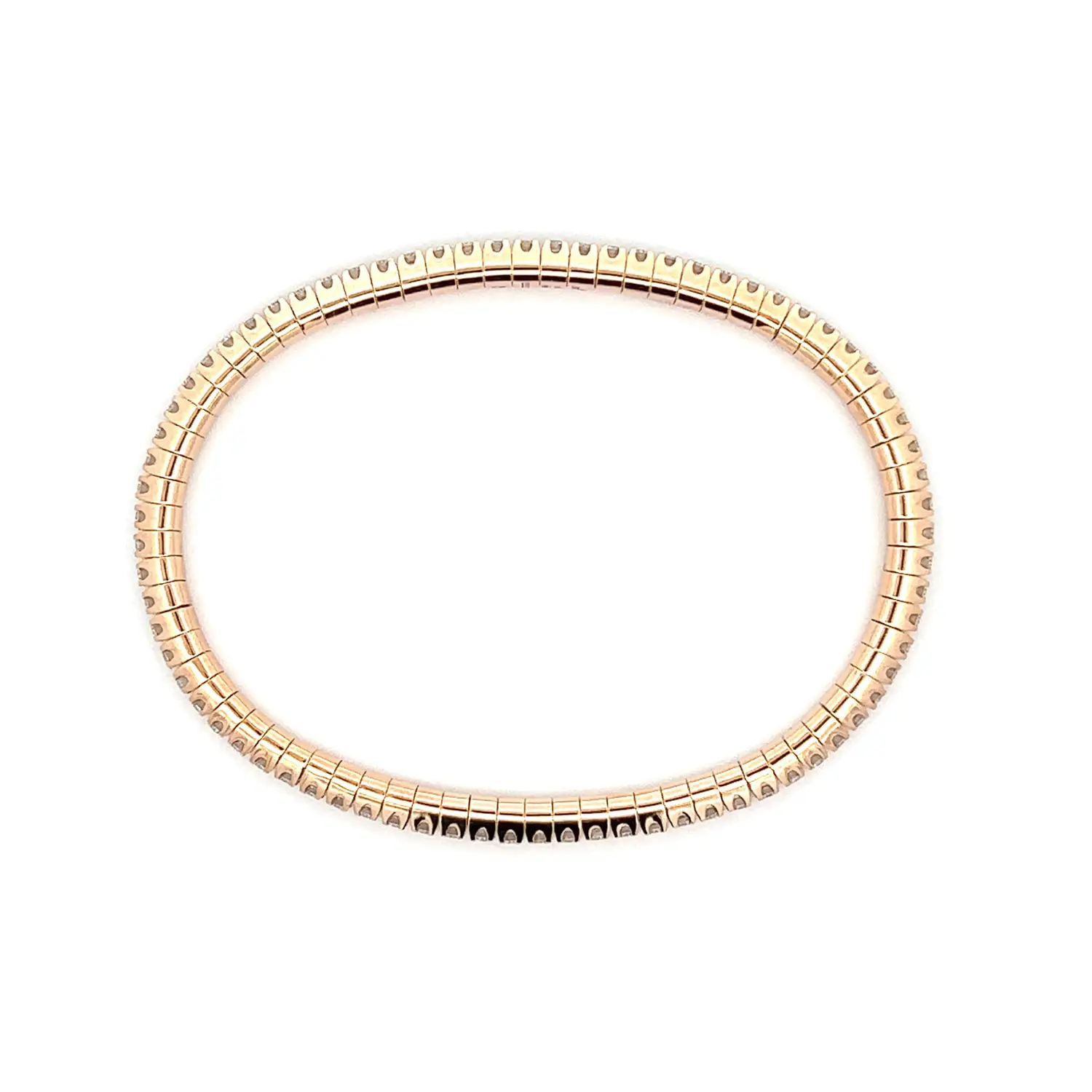 这款 18K 玫瑰金钻石网球手链 展现了优雅与现代奢华的完美平衡。每一颗钻石都精密镶嵌于细腻的玫瑰金线上,环绕手腕形成 连续闪耀的光之流。简约的设计低调而迷人,散发出柔和的光辉。