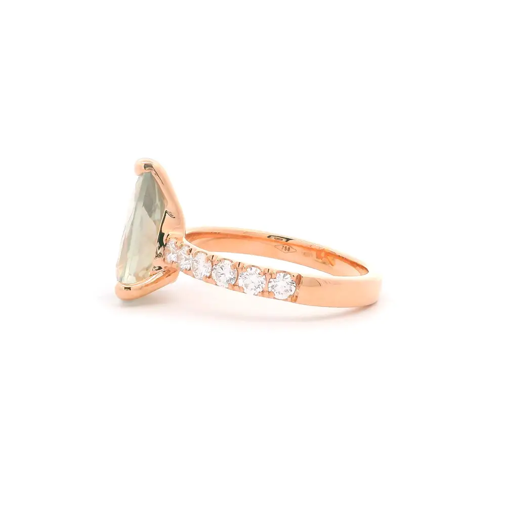 戒圈上点缀着一排 圆形切割钻石,其闪耀的光芒映衬出玫瑰金的温润色泽,为戒指增添奢华光彩。碧玺与钻石的组合形成和谐的对比,令人一见倾心。