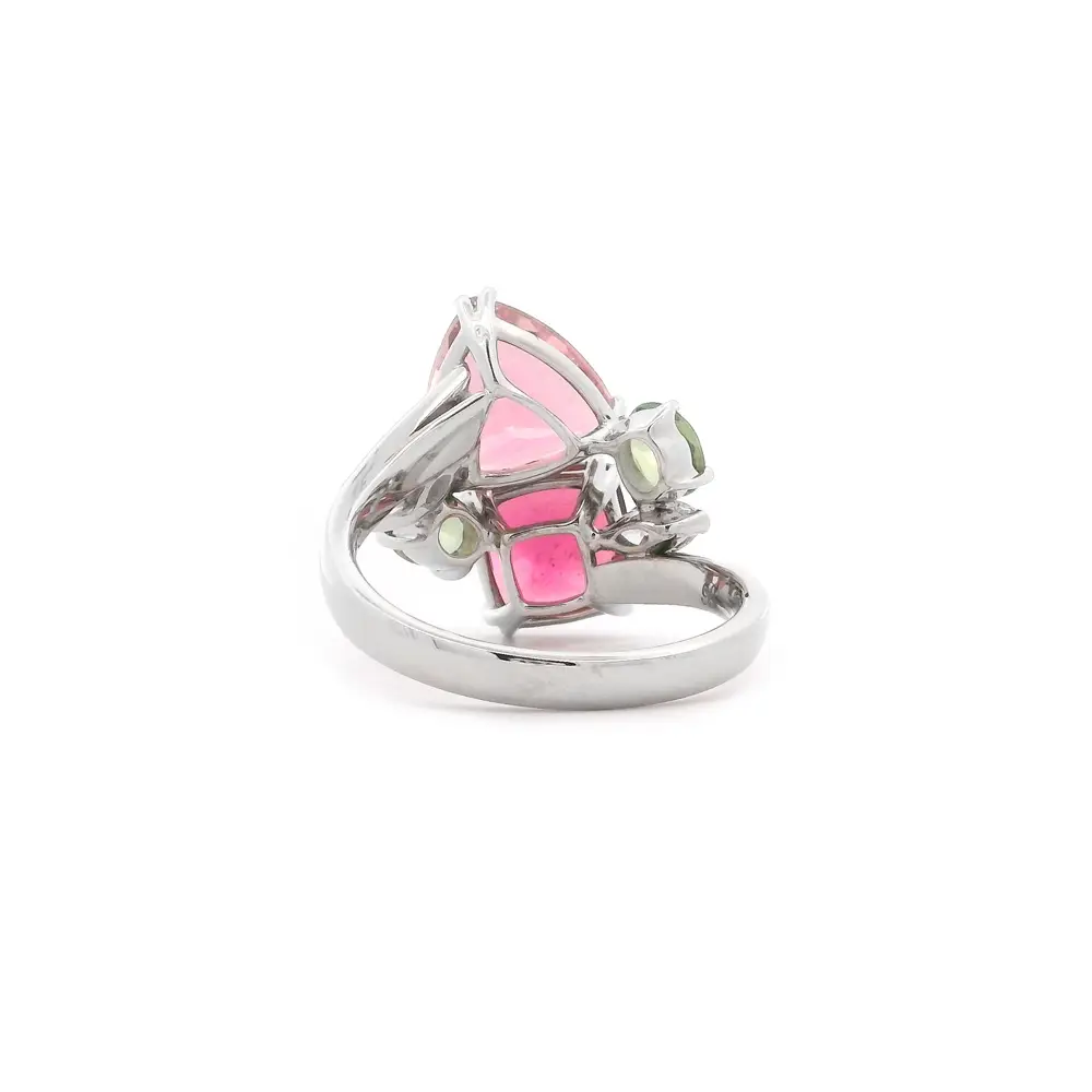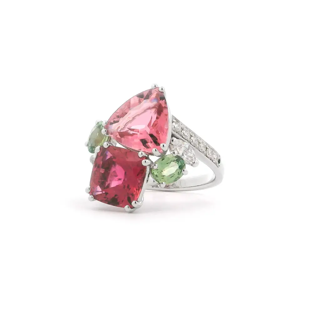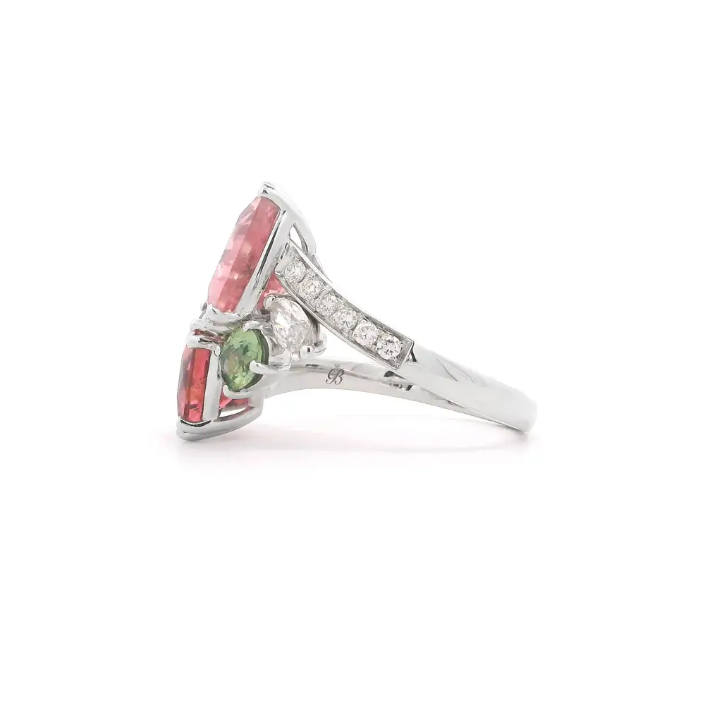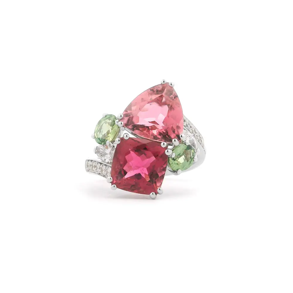 这款迷人的戒指由 18K 白金 制成,闪耀着色彩与造型的独特魅力。中央镶嵌两颗醒目的 粉色碧玺,采用独特切割,展现出浓烈而耀眼的光彩。