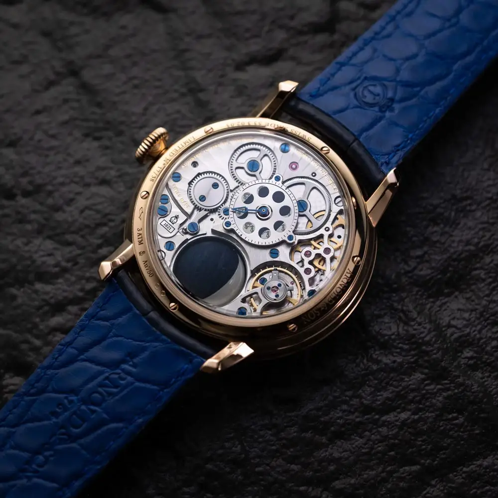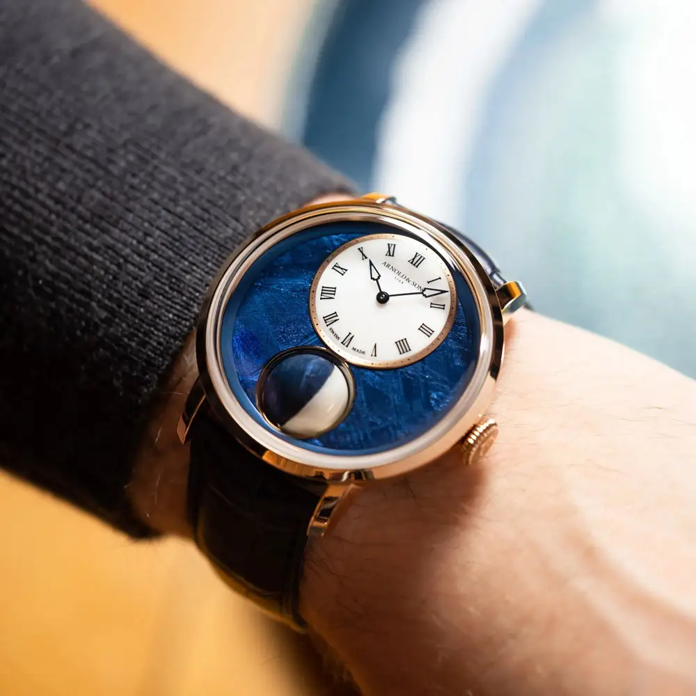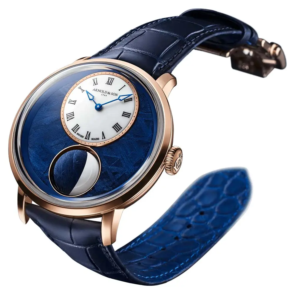 最引人注目的设计是3D旋转月相,由一半Cacholong欧泊与一半蓝色PVD陨石构成。该机制由自主研发的A&S1021机芯驱动,提供长达90小时动力储备,月相精度可维持122年误差仅一天。