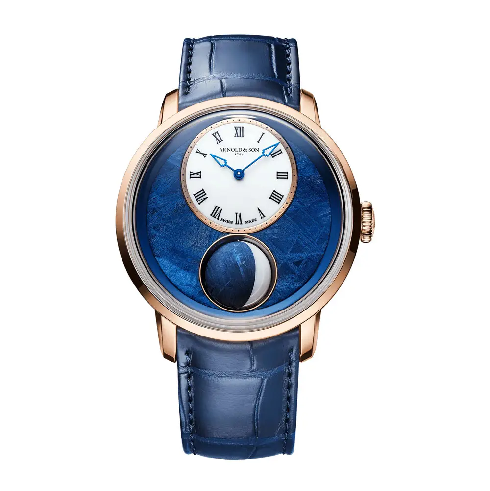 44毫米表壳采用18K红金打造,散发出典雅尊贵的气质。表盘由蓝色PVD陨石打造,营造出如夜空般神秘的视觉效果。显示小时与分钟的副表盘由乳白色欧泊石制成,与月相功能相得益彰。