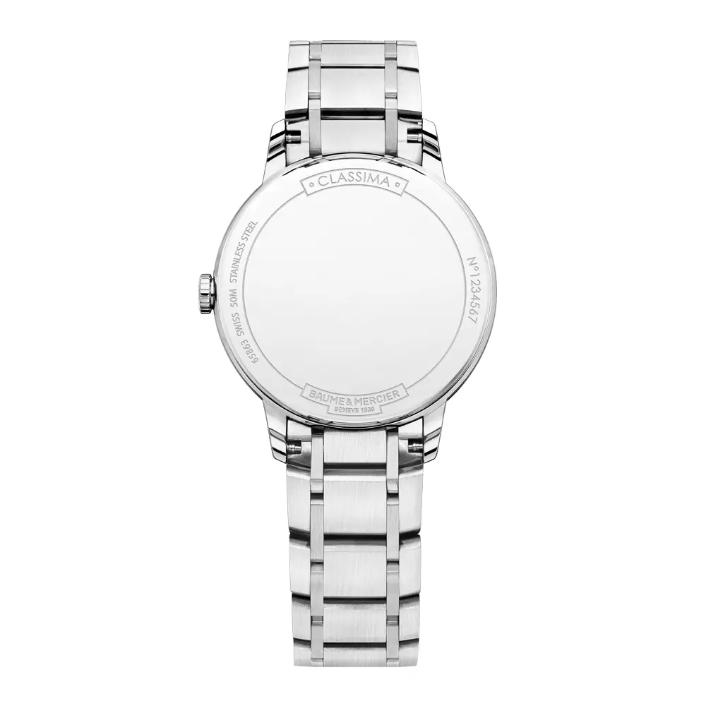 Baume & Mercier Classima Lady M0A10477 展现出 女性优雅与瑞士精密工艺 的完美融合。31 毫米精钢表壳 搭配 蓝色太阳纹表盘,配有 罗马数字时标与 3 点钟日期显示,展现出高雅与简约并存的格调,延续 Classima 系列的经典美学。