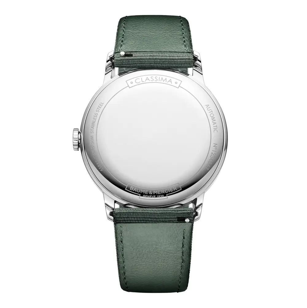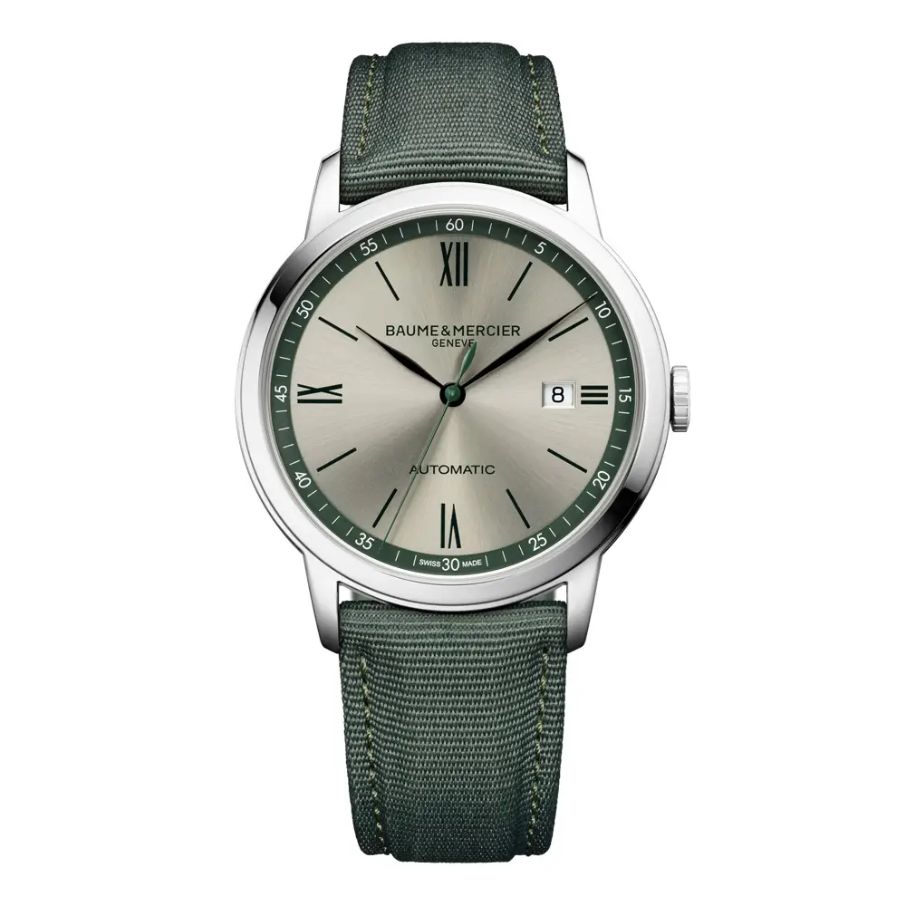 灰色表盘饰有精致的刻度和位于12点、3点、6点和9点位置的罗马数字,营造出经典而简洁的印象。表盘边缘的精致绿色点缀为手表增添了现代感,与橄榄绿色的纺织表带完美搭配,舒适而时尚。在3点钟位置有一个实用的日期显示窗口。