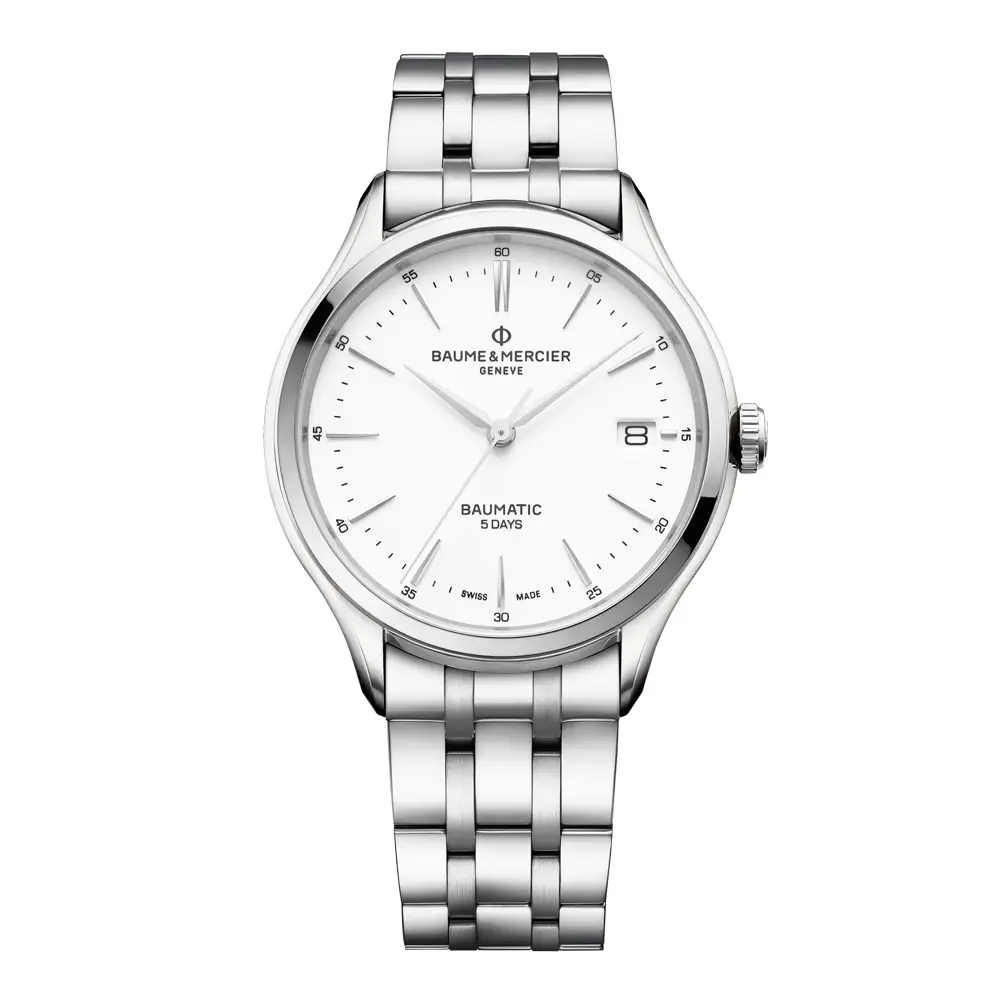 Baume & Mercier Clifton Baumatic M0A10400 将现代科技与永恒优雅完美结合。40 毫米抛光精钢表壳 搭配 银色纹理表盘 和纤细时标,营造出简洁精致的美感。五链节精钢表带 赋予腕表多样魅力,既适合日常佩戴,又适合正式场合。