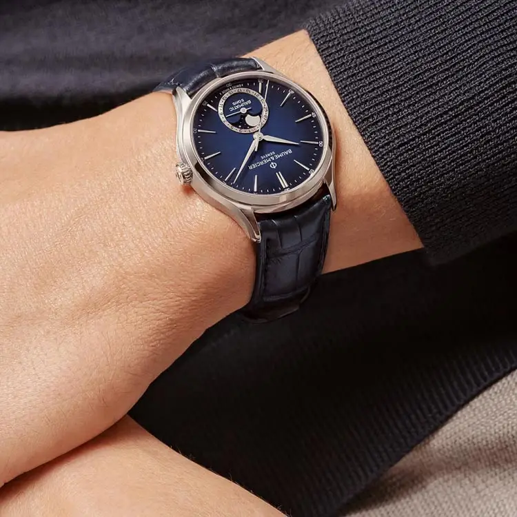 39 毫米不锈钢圆形表壳设计优雅,佩戴舒适。蓝宝石水晶镜面保护着引人注目的 蓝色指针式表盘,清晰而富有格调。和谐的设计搭配实用的 日期显示 和 月相功能,增添浪漫与奢华的气息。