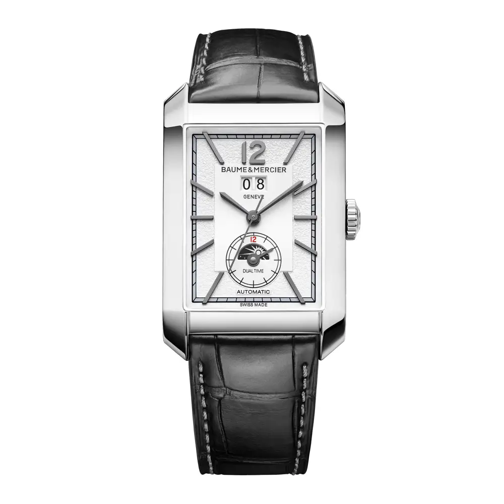 Baume & Mercier Hampton M0A10523 以现代视角重新诠释标志性的装饰艺术风格。48 × 31 毫米抛光精钢表壳 搭配 银色纹理表盘,配有醒目的 红色第二时区指针,展现独特个性。黑色鳄鱼皮表带 配以灰色缝线,尽显优雅气质。