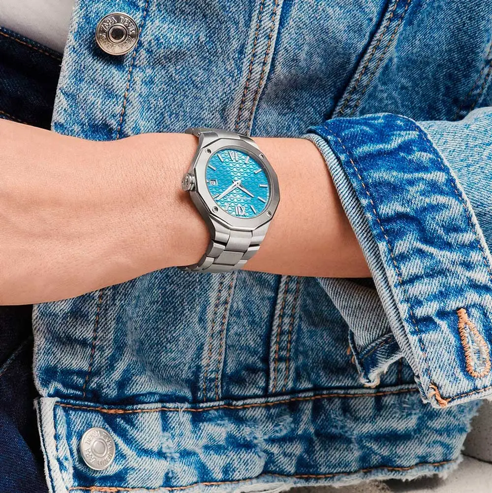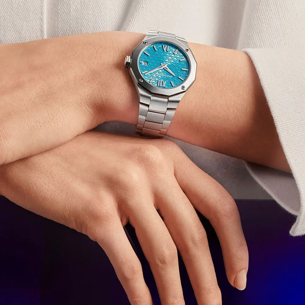 浅蓝色表盘 带有细腻的 波浪纹理,仿佛海边的清新气息。银色指针与时标,搭配 12 点与 6 点的罗马数字,确保清晰易读,3 点位置的日期显示 提升日常实用性。