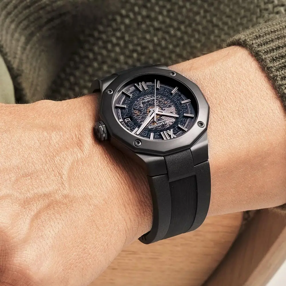 Baume & Mercier Riviera M0A10617 诠释了运动优雅与现代风格的完美结合。42 毫米抛光精钢表壳 搭配系列标志性的 十二边形表圈与四颗螺钉设计,呈现独特个性。烟灰色蓝宝石表盘 半透机芯结构,与 黑色橡胶表带 形成精致对比。
