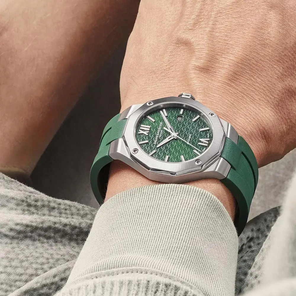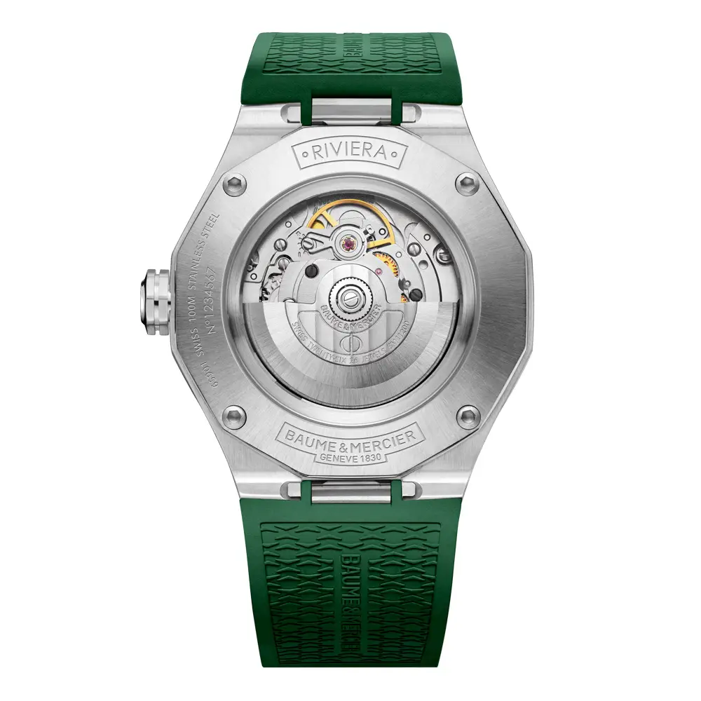 腕表搭载 自动机械机芯,确保精准与顺畅运作。绿色橡胶表带配折叠扣 强调运动气息并提供佩戴舒适度。具备 10 ATM(100 米)防水性能 的 Baume & Mercier Riviera M0A10618 是都市优雅与活力生活方式的理想之选。