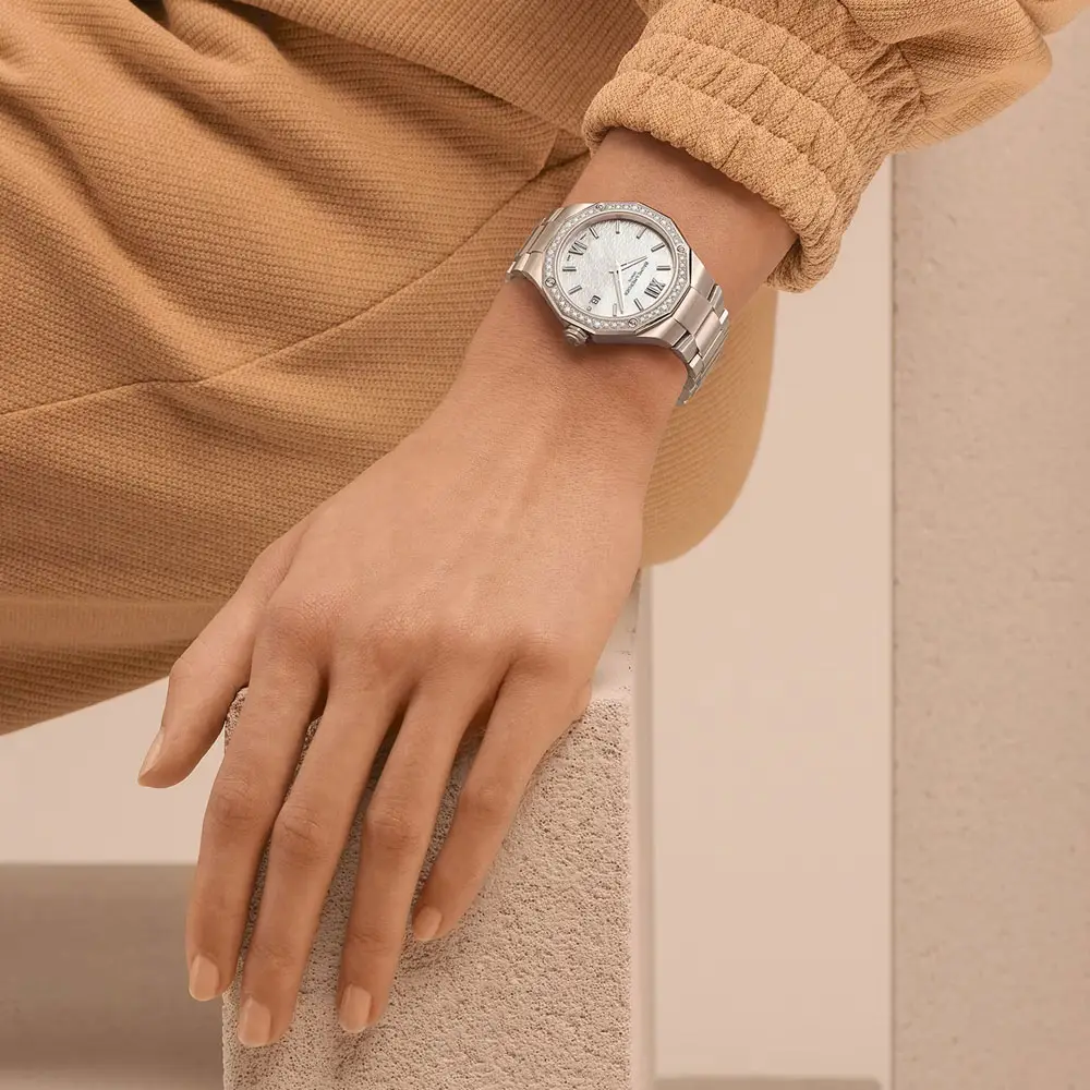 36 毫米精钢表壳 搭配 镶钻表圈,增添璀璨与高贵气质。珍珠母贝表盘 呈现柔和光泽,配以 防刮擦蓝宝石水晶镜面 保护。3 点位置设有日期显示窗,兼顾美感与实用性。