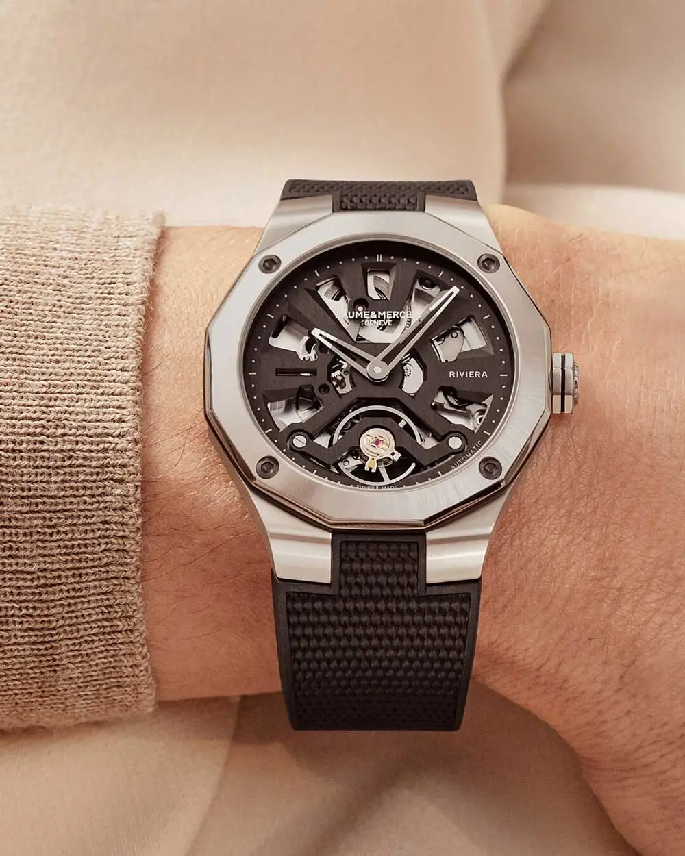 Baume & Mercier Riviera Skeleton M0A10721 体现了现代设计与制表工艺,展现每一个细节中的机械之美。这款腕表通过醒目的镂空表盘,令人着迷地展示机芯的内部运作之美。