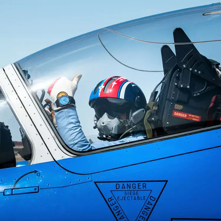 42 毫米方形表壳采用黑色陶瓷制成,轻盈坚固,具备防过敏和高抗刮特性。防反光蓝宝石玻璃覆盖蓝色表盘,搭配红、白、蓝三色细节,展现法兰西巡逻飞行队的标志性风格。