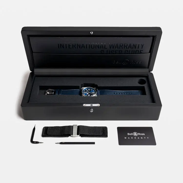 腕表搭载 自动上链机芯 BR-CAL.302,提供 约54小时动力储存,精准可靠。蓝色皮表带配针扣 与表盘相呼应,佩戴舒适。具备 100米(10 bar)防水性能,Bell & Ross BR 03 Blue Steel 诠释 风格、性能与永恒优雅。