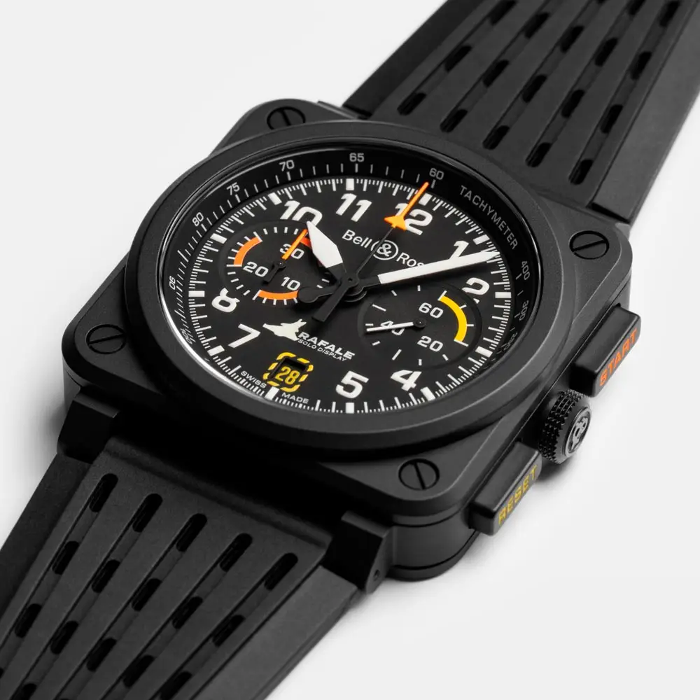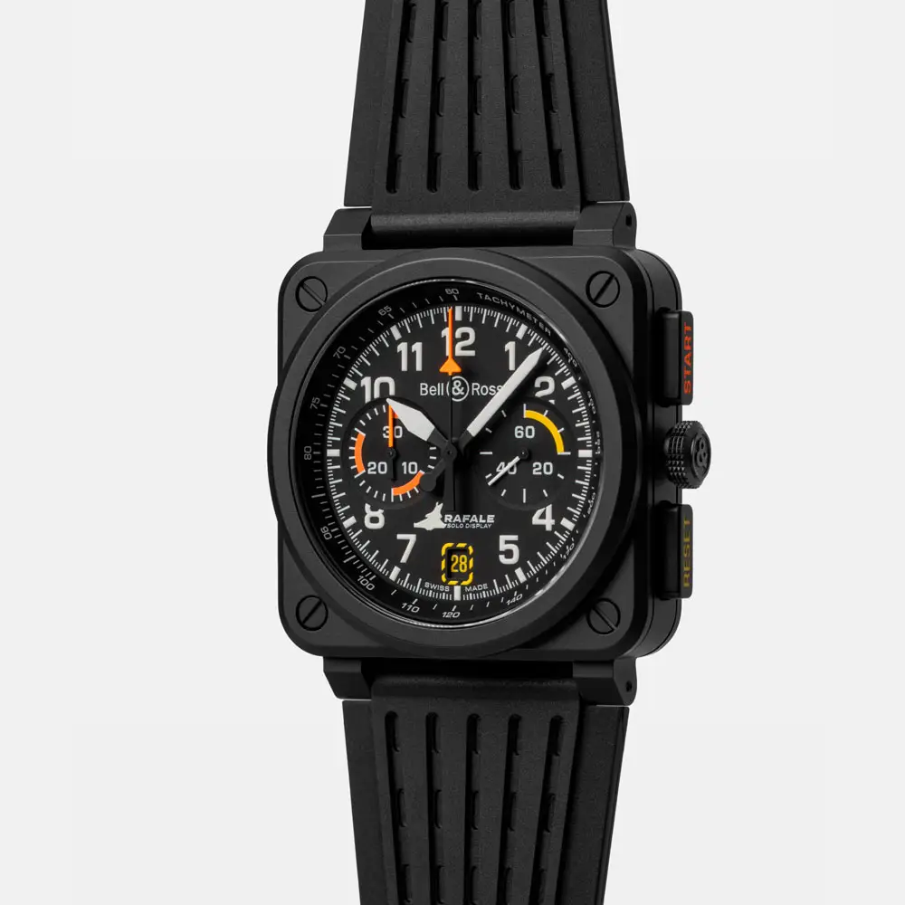 腕表搭载可靠的 自动计时机芯 BR-CAL.301,提供最长 42 小时动力储备。哑黑色表盘配备醒目的 白色夜光阿拉伯数字、对比鲜明的橙色计时指针,以及印有 Rafale 战机剪影 的秒针细节——致敬合作伙伴的精妙符号。