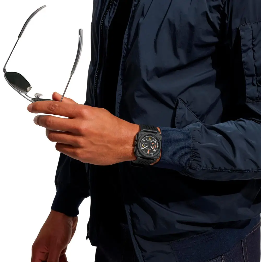 Bell & Ross BR-03 Chrono Rafale Solo Display 全球限量 500 枚,向享誉盛名的特技飞行团队 Rafale Solo Display 致敬。42 毫米表壳采用微喷砂黑色陶瓷制成,轻盈、坚固且极具技术美感。