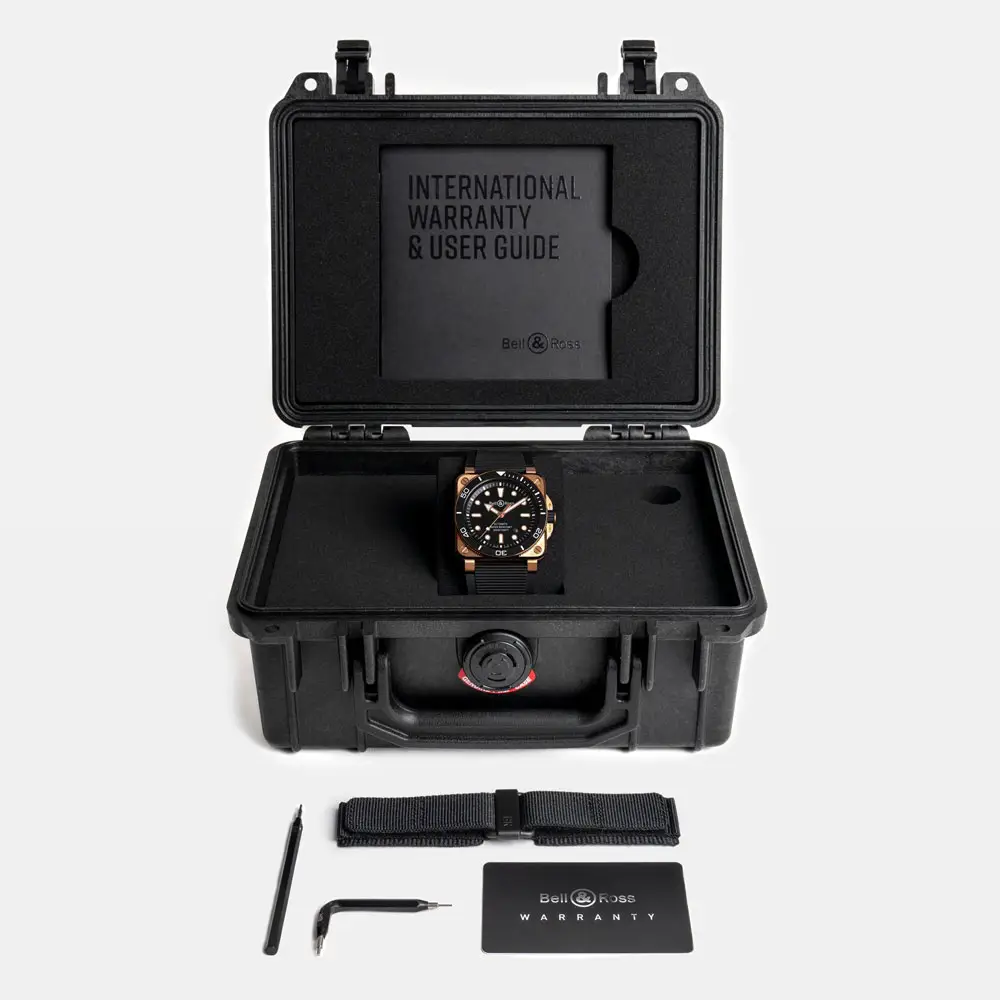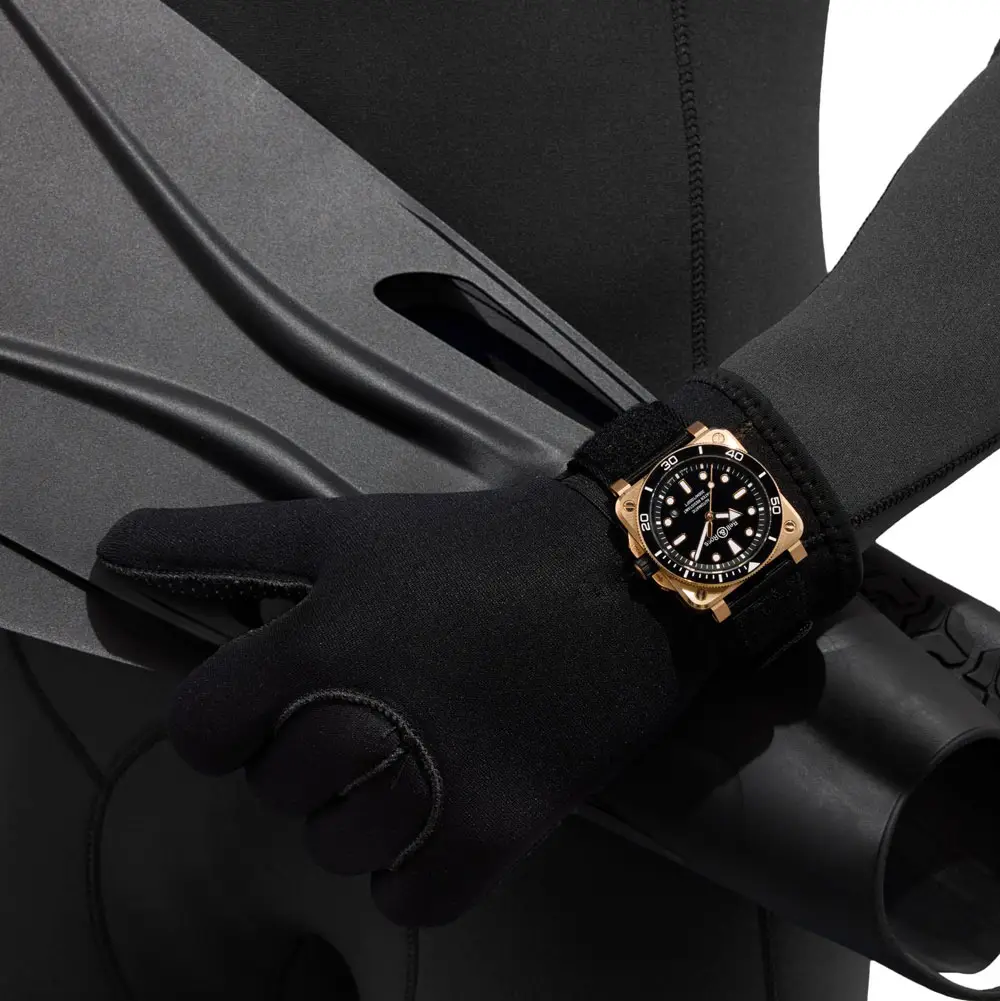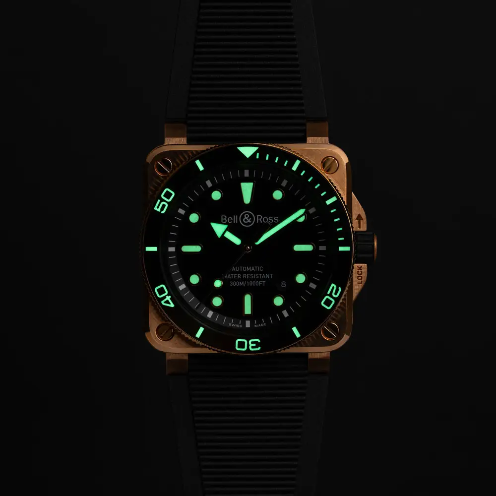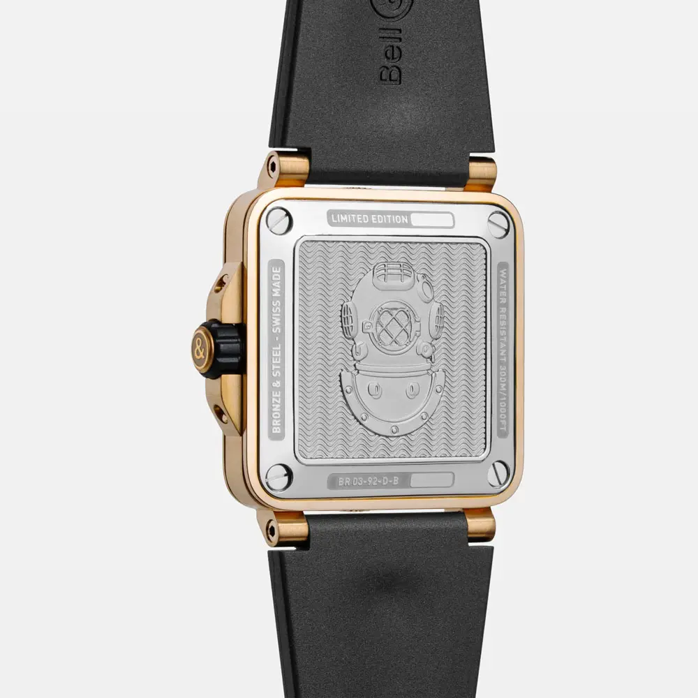 Bell & Ross BR 03 Diver Black Bronze 将专业潜水性能与航空仪表风格设计相结合。42毫米青铜表壳(CuSn8合金)会随着时间形成独特包浆。标志性方形设计搭配单向旋转陶瓷表圈、旋入式表冠以及300米防水(ISO 6425),满足专业潜水需求。