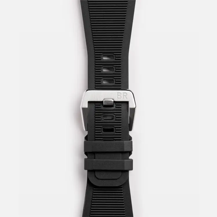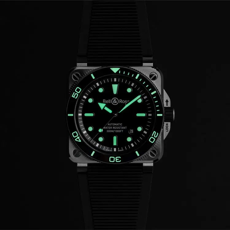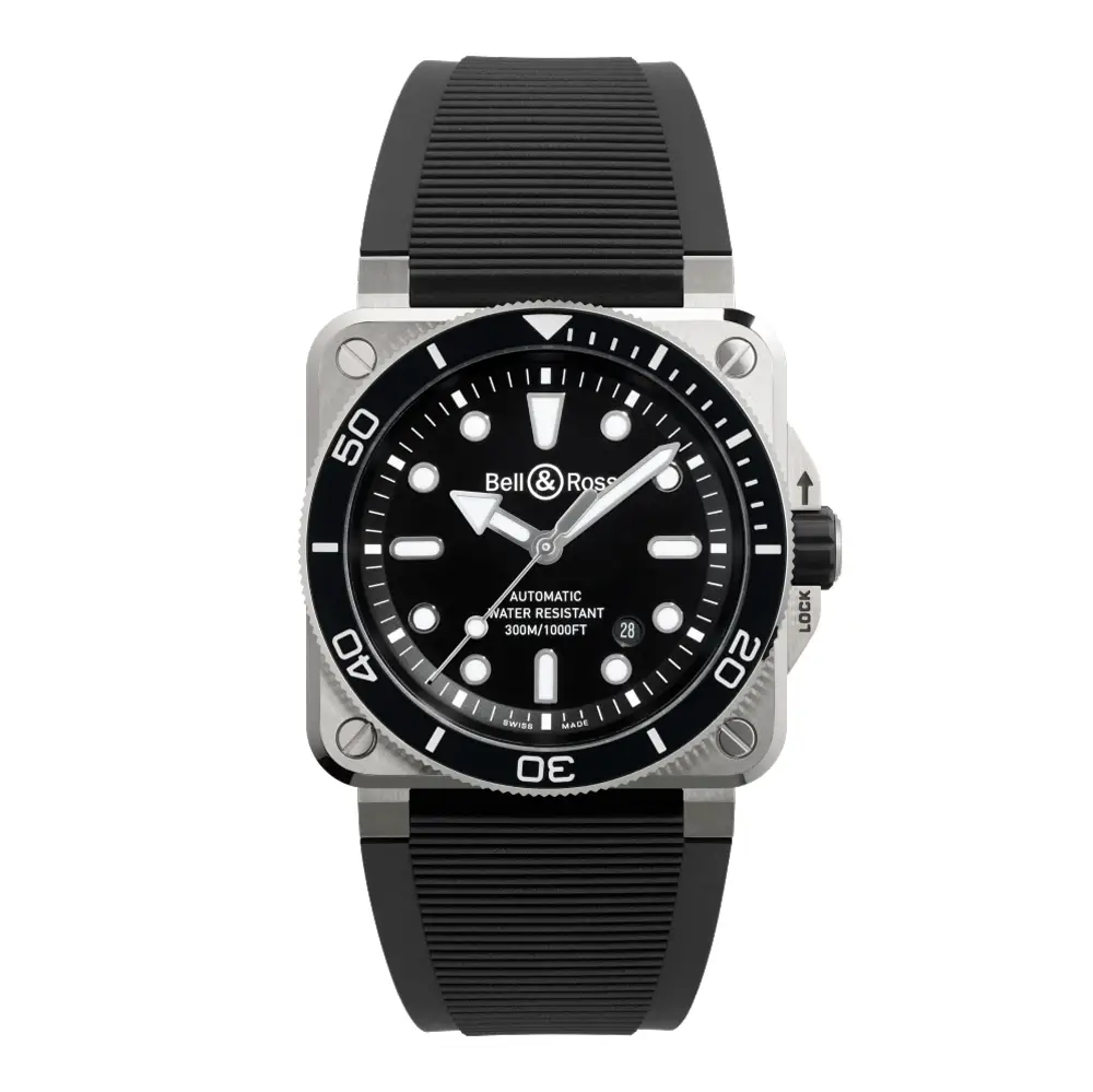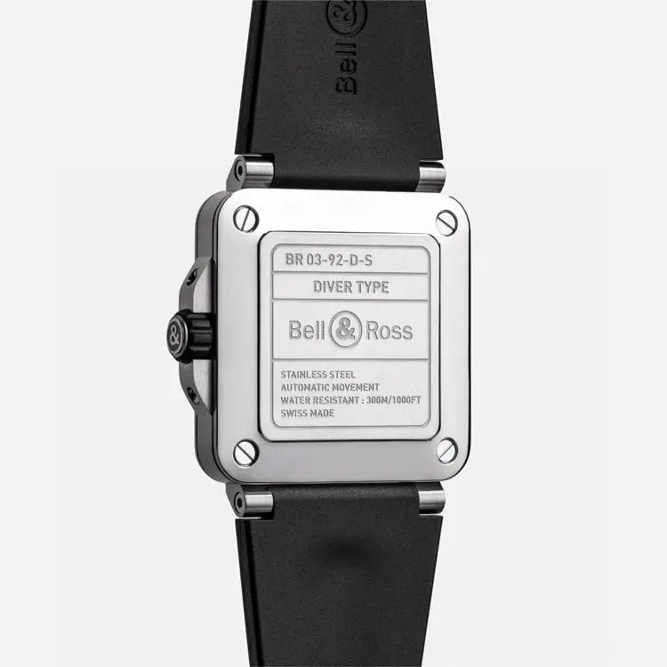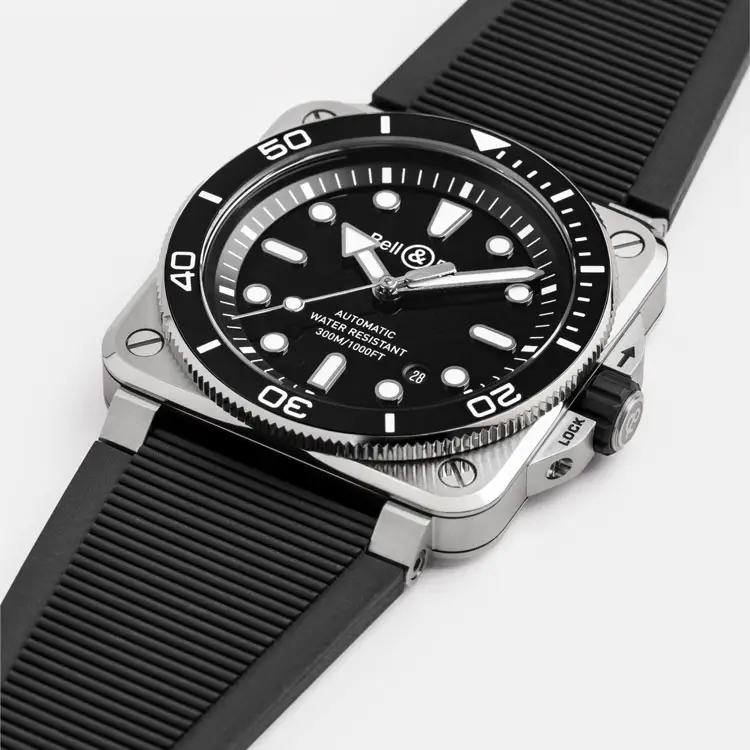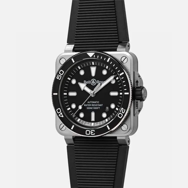 腕表搭载 自动上链机芯 BR-CAL.302-1,具备 约54小时动力储存,精准可靠。黑色橡胶表带与针扣 佩戴舒适且耐用。具备 300米(30 bar)防水性能 并符合 ISO 6425 标准,Bell & Ross BR 03 Diver Black Steel 是 力量、精准与专业表现 的象征。