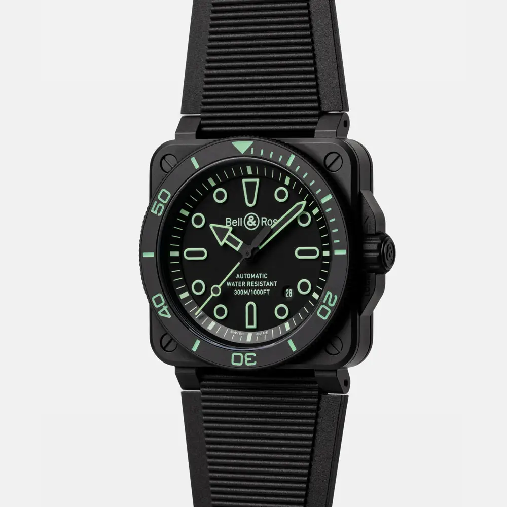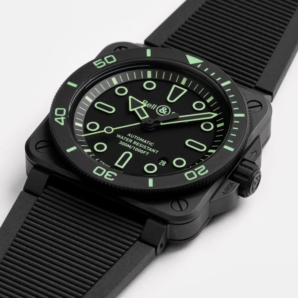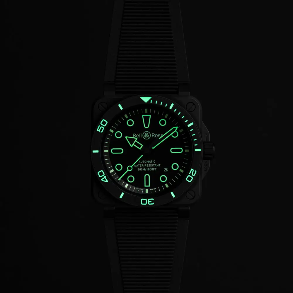 Bell & Ross BR 03 系列中的BR 03-92 Diver LUM Outline将专业潜水功能与简约、近乎单色的外观相结合。直径 42 毫米的坚固陶瓷表壳具有极强的抗划痕和耐腐蚀性能,亚光表面处理减少了眩光,增强了腕表的技术表现力。