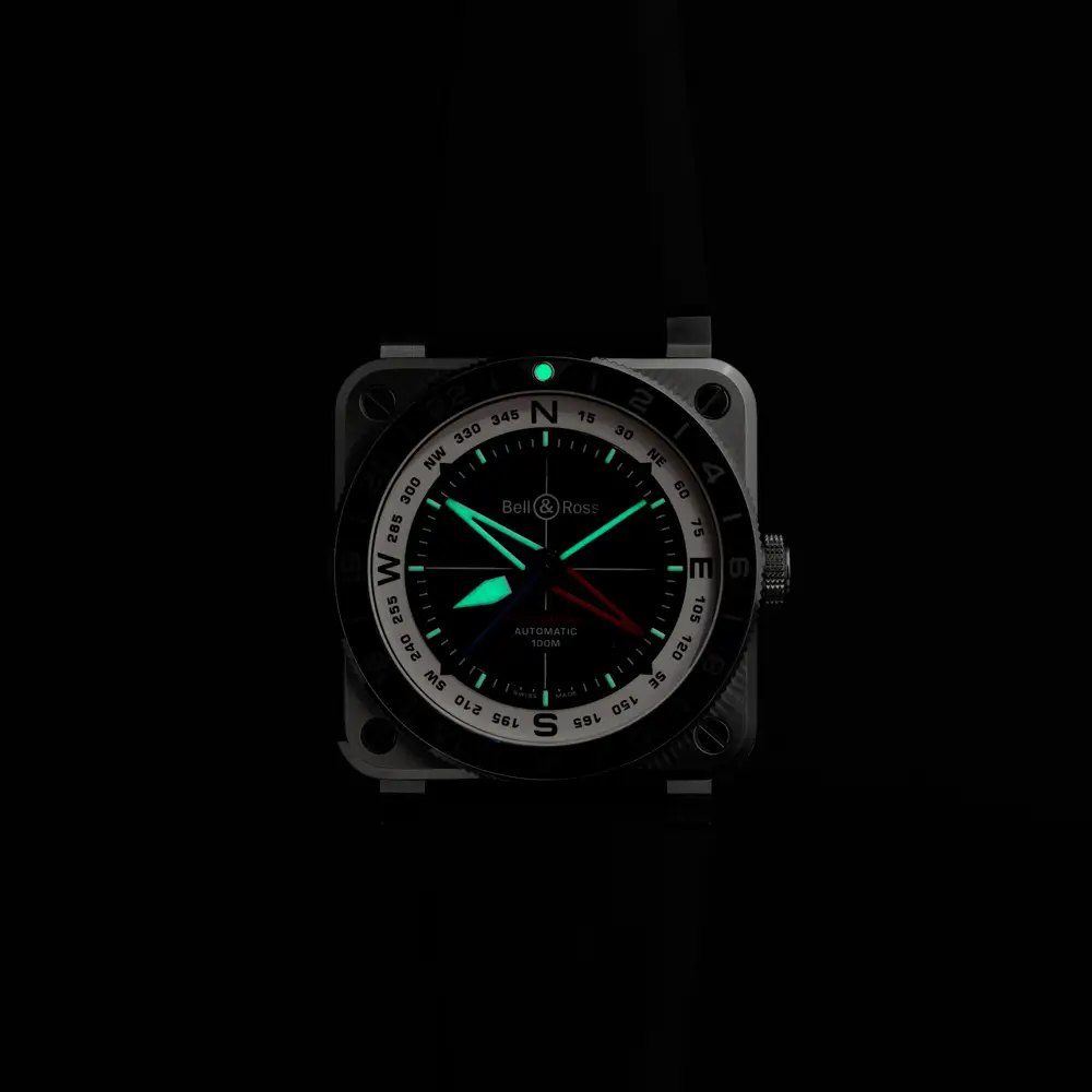 腕表搭载 自动上链机芯 BR-CAL.303,确保精准与可靠。黑色橡胶表带配精钢针扣 舒适耐用。具备 100 米(10 ATM)防水性能,BR 03 GMT Compass 是兼具旅行与日常佩戴的理想伙伴,诠释 航空精神与专业功能美学。