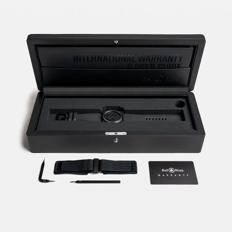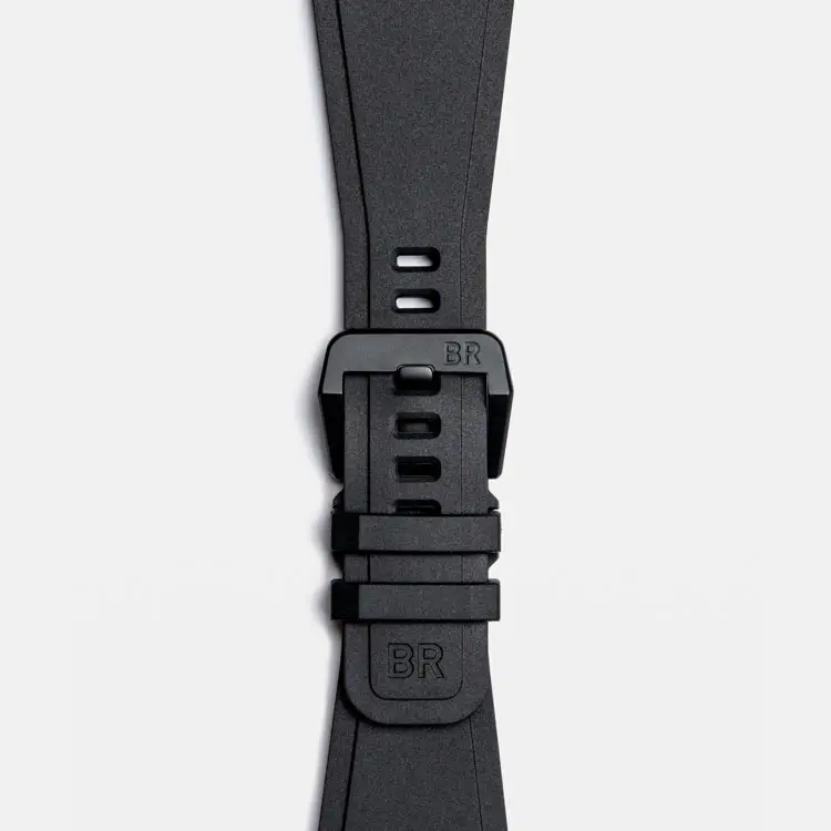 腕表搭载 自动上链机芯 BR-CAL.302,拥有 约54小时动力储存,精准可靠。黑色橡胶表带配针扣 舒适贴合,呼应整体哑光风格。具备 100米(10 bar)防水性能,Bell & Ross BR 03 Phantom 象征 静谧力量与现代优雅。