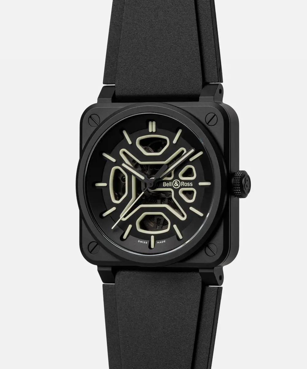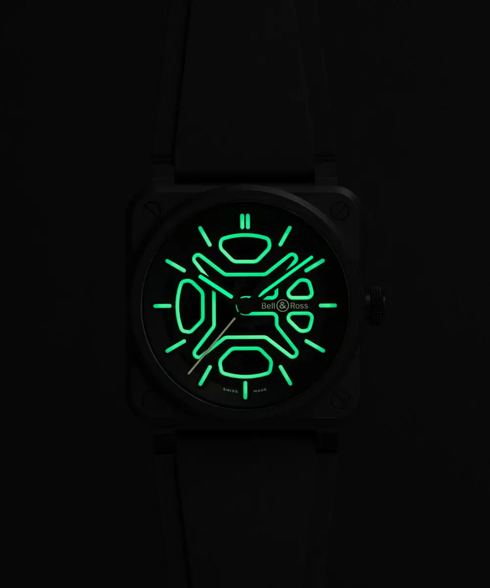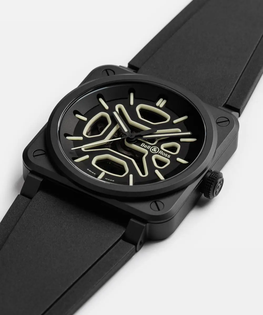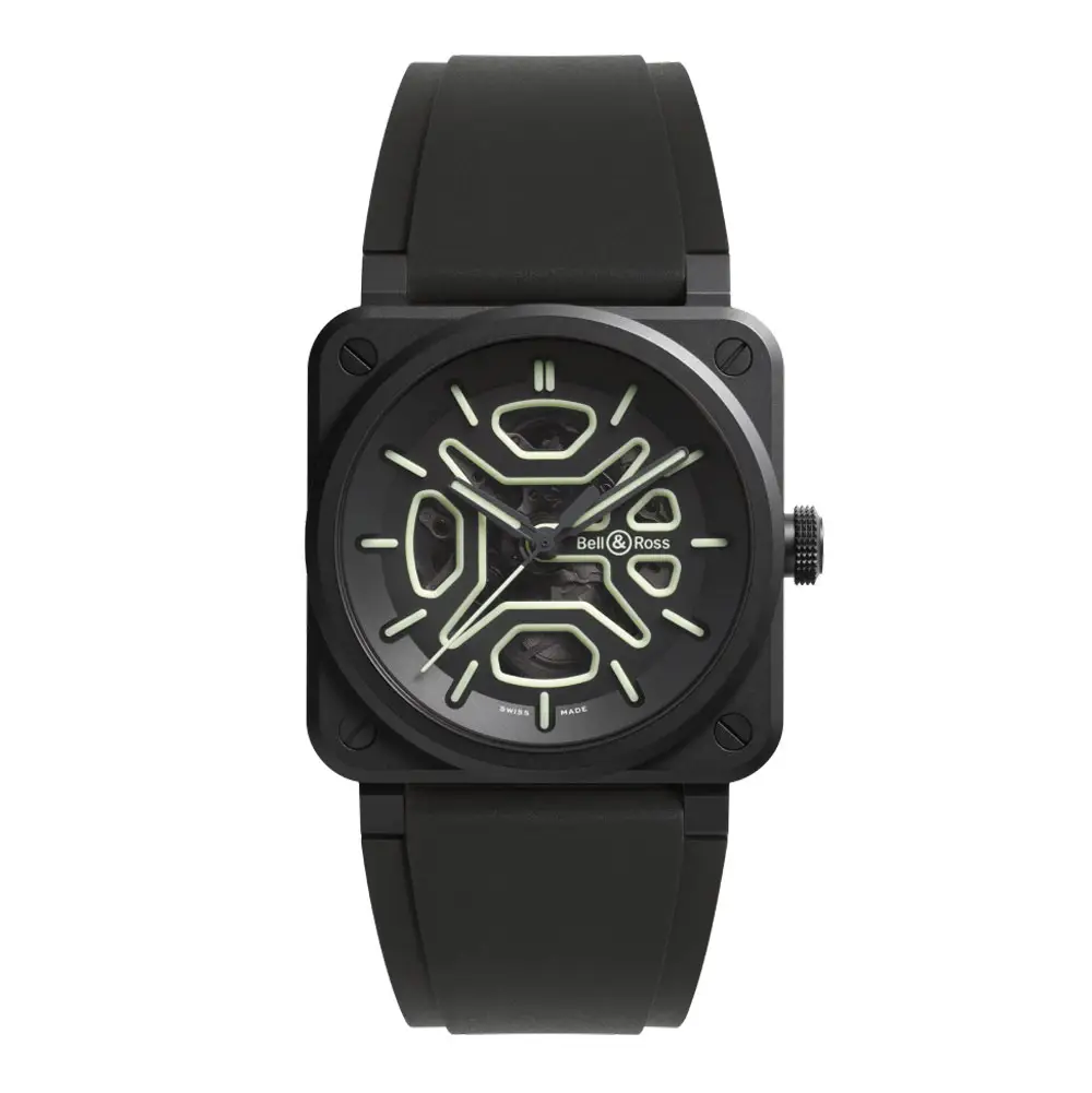 Bell & Ross BR-03 Skeleton Lum Ceramic将品牌标志性的方形设计与现代材料和精密技术相结合。经过防眩处理的蓝宝石表镜确保了镂空表盘的清晰视野,而 100 米的防水性能即使在恶劣条件下也能保护腕表。