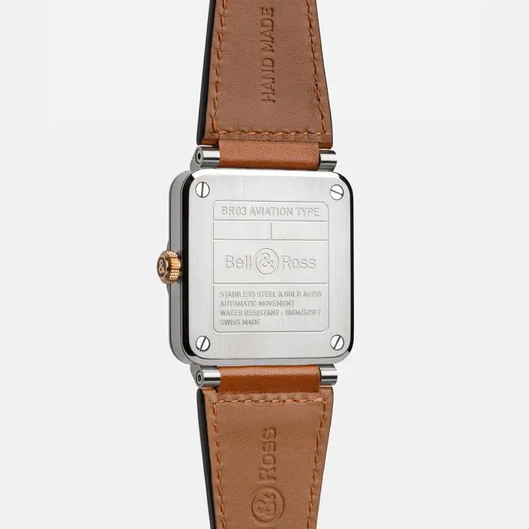 腕表搭载 自动上链机芯 BR-CAL.302-1,提供 约54小时动力储存,精准可靠。棕色皮表带配针扣 与金色细节完美呼应,佩戴舒适。具备 100米(10 bar)防水性能,Bell & Ross BR 03 White Steel & Gold 象征 现代奢华与永恒优雅。