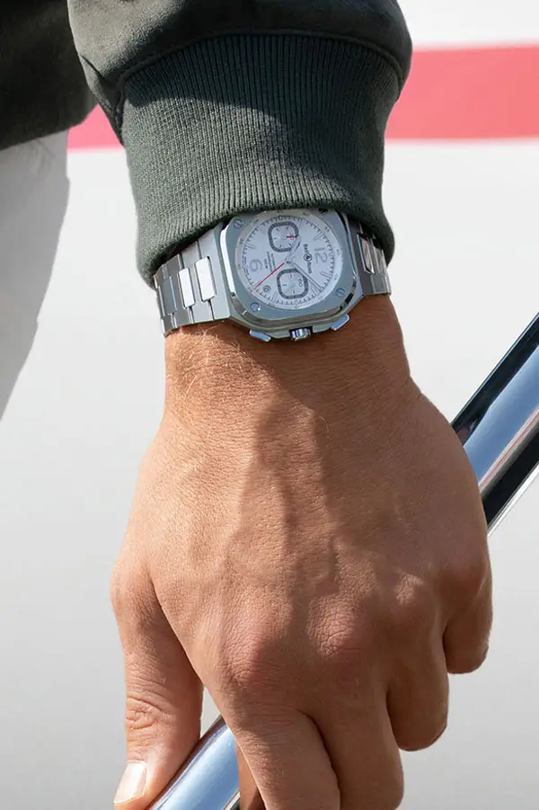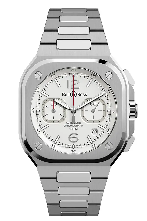 Bell & Ross BR 05 Chrono White Hawk 结合了坚固设计、实用功能与瑞士制表的精准工艺。其 42毫米方形不锈钢表壳 展现出现代感与强烈的个性。
