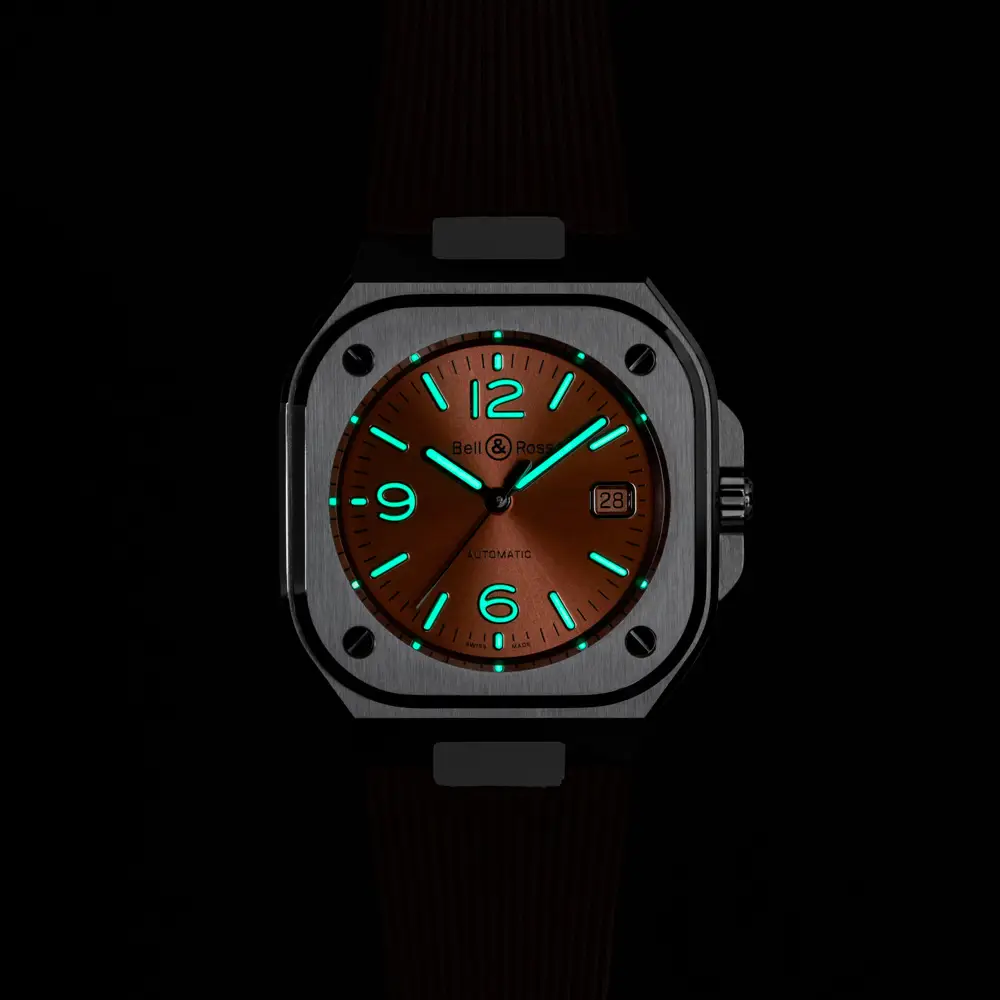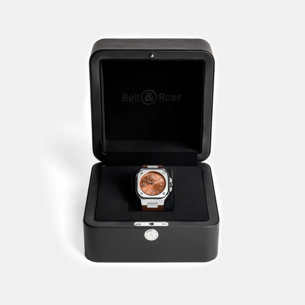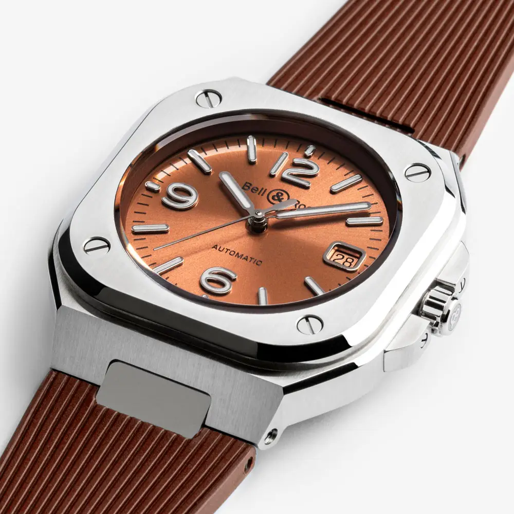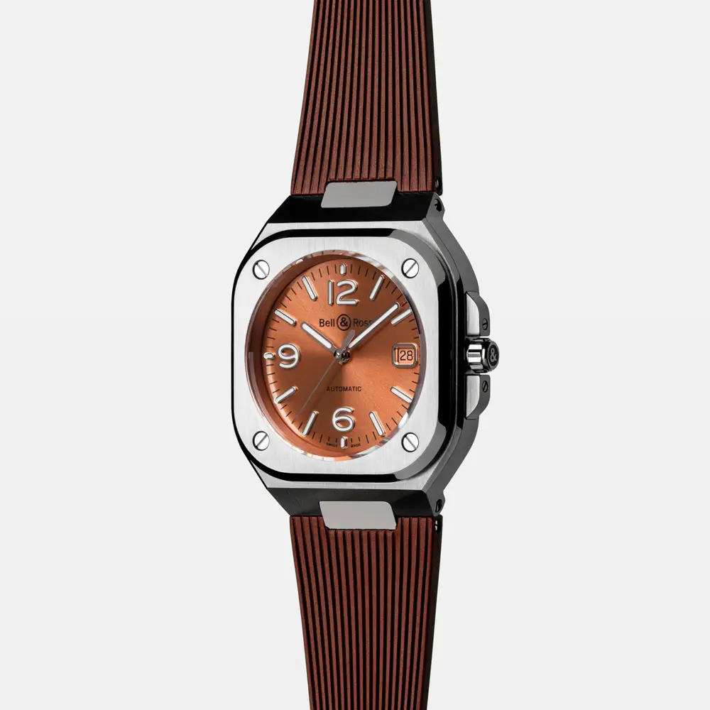 Bell & Ross BR 05 Copper Brown(型号 BR05A-BR-ST/SRB) 展现了 都市优雅与技术精密的完美融合。其 暖色铜棕太阳纹表盘 赋予腕表独特个性,而不锈钢表壳则突显出永恒的格调。