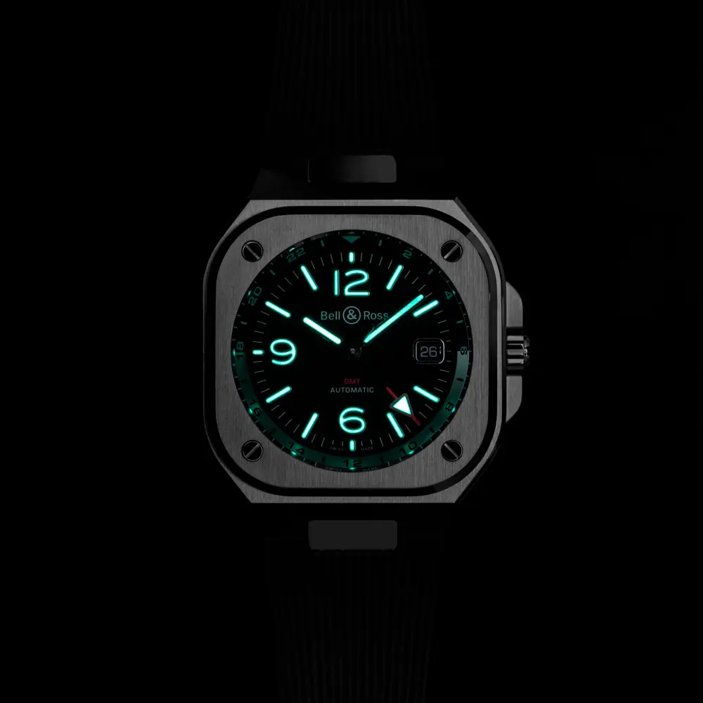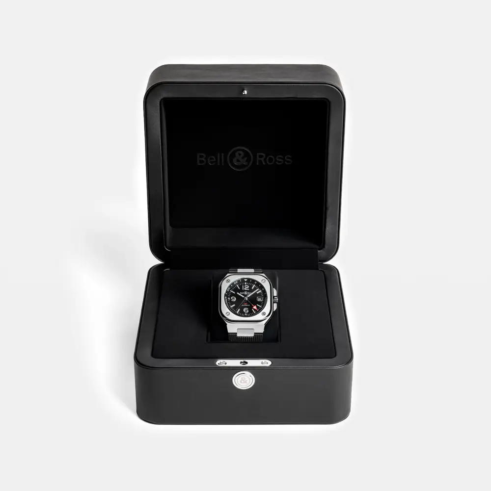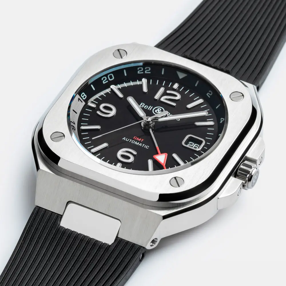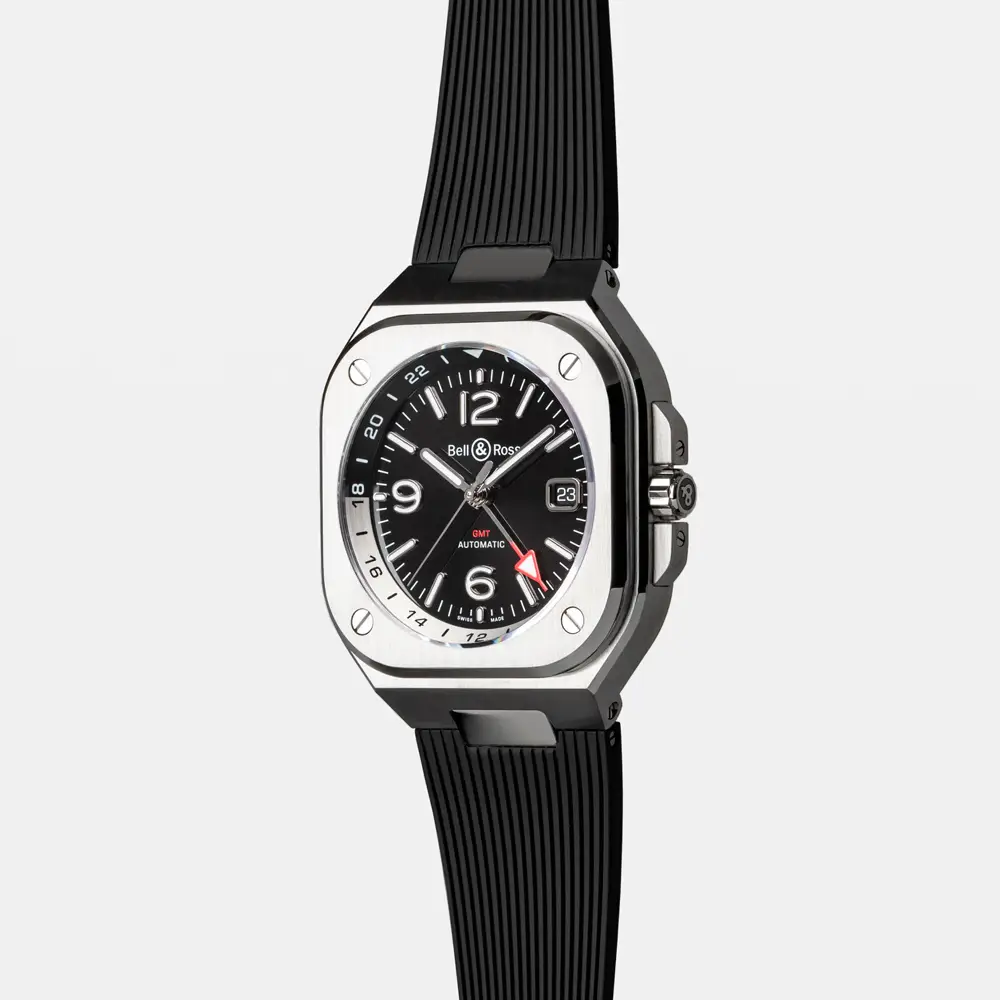 Bell & Ross BR 05 GMT 将优雅设计与实用功能完美结合。其 41 毫米方形不锈钢表壳 展现强劲质感,黑色指针式表盘配备 红色 GMT 指针,便于读取第二时区时间。