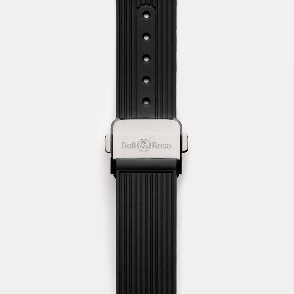 黑色橡胶表带配折叠扣提供舒适佩戴体验,突显技术美感。