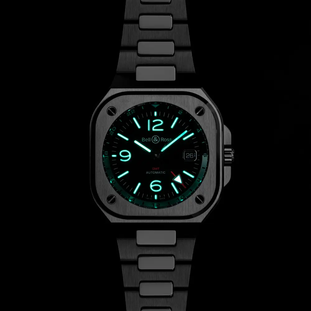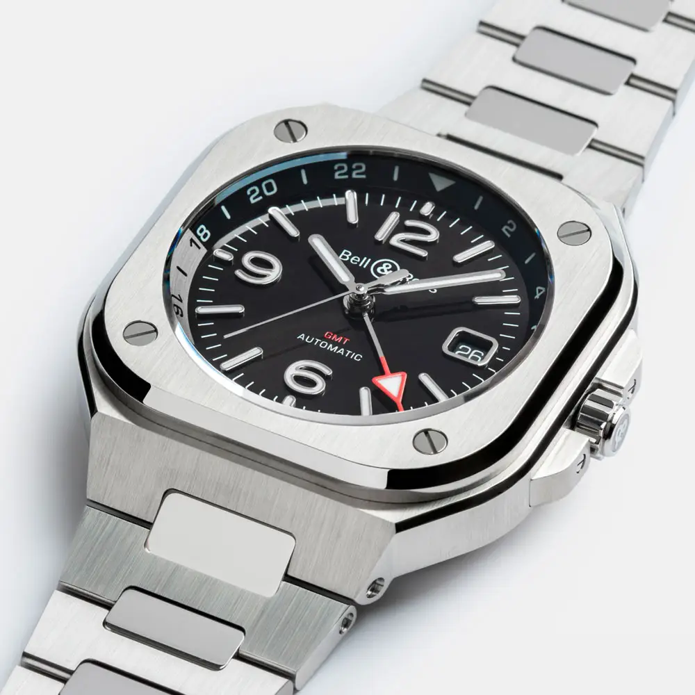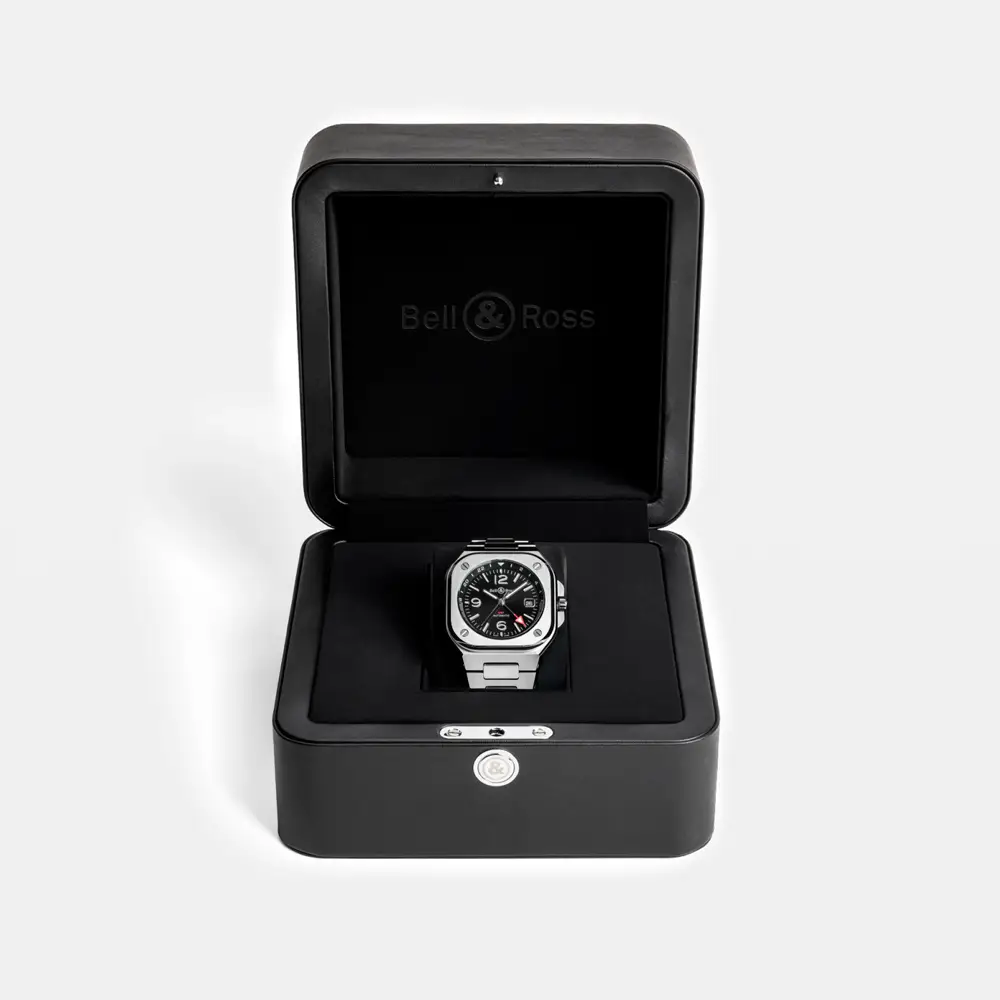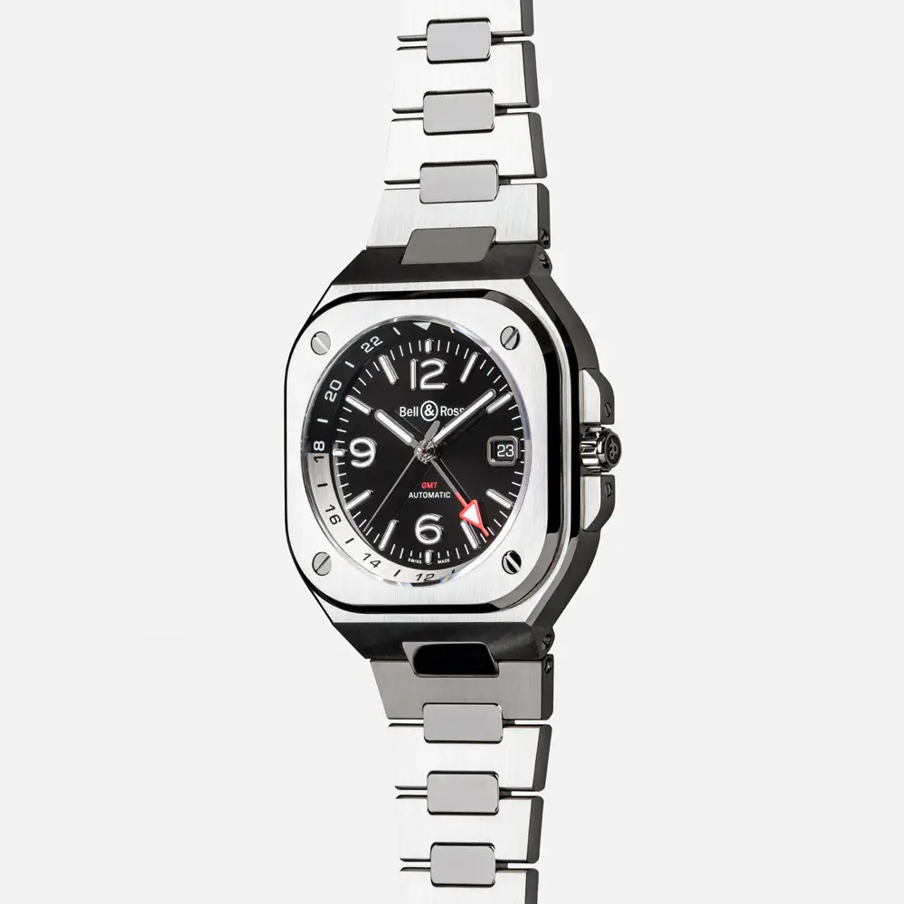 Bell & Ross BR 05 GMT(型号 BR05G-BL-ST/SST) 完美融合了 都市优雅与双时区(GMT)功能。专为穿梭于全球时区的现代旅行者打造,平衡了精密技术与时尚美学。
