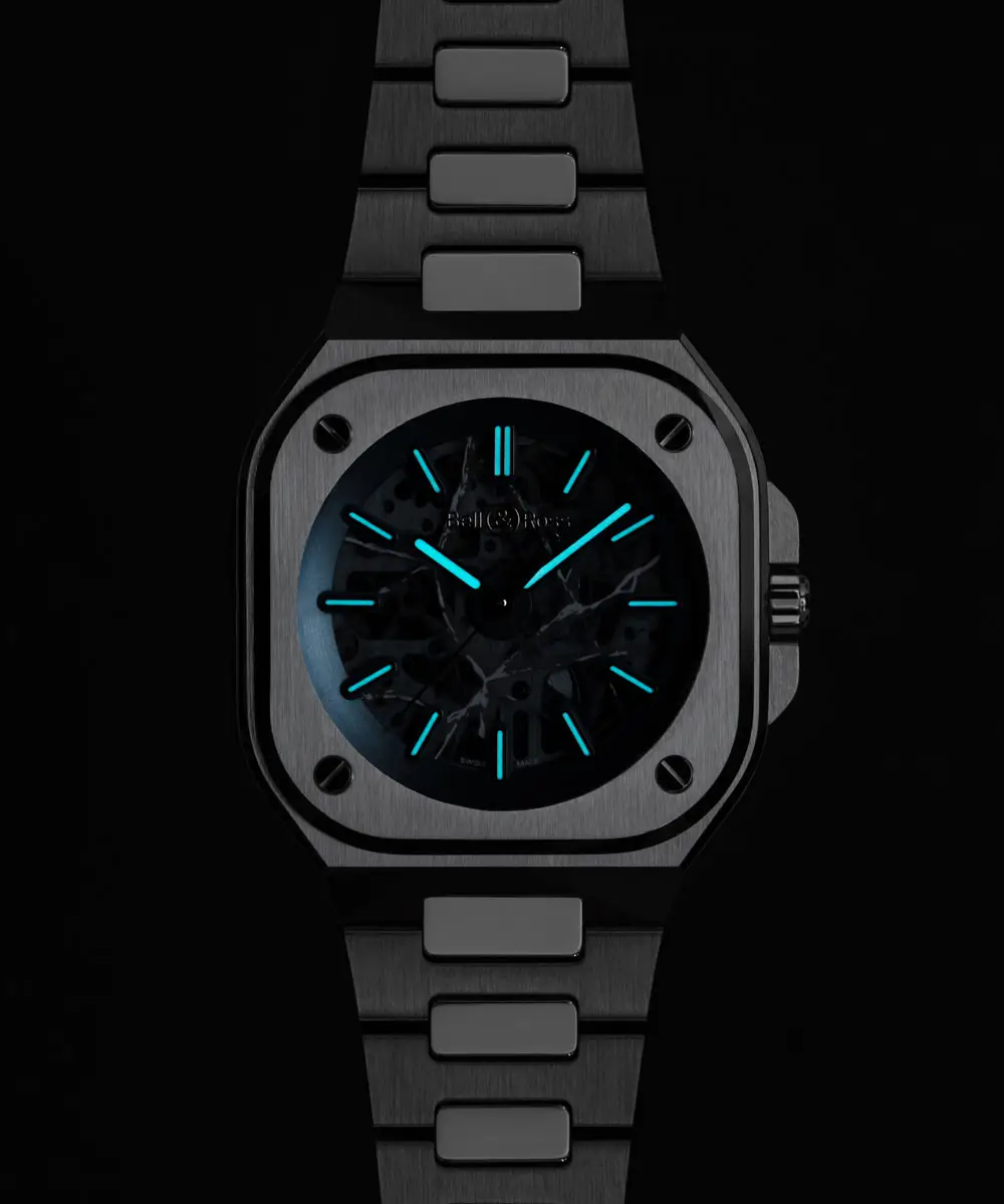 BR 05 表款在瑞士拉绍德封制造,结合了自动机芯的精密机械和不锈钢、玫瑰金、镂空饰面和陶瓷等奢华材质。此外,还有一些表款配有一体化精钢拉紧装置、橡胶表带或镶钻细节,外观更加独特。