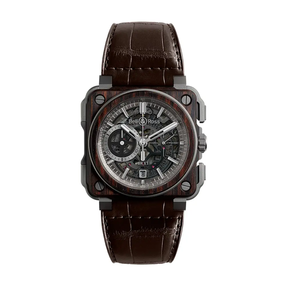 Bell & Ross BR-X1 Wood BRX1-WD-TI 将前沿技术与自然奢华巧妙融合。其 45 毫米钛金属表壳 搭配独特的 木质表圈,赋予腕表非凡个性与精致外观。镂空设计的灰色蓝宝石表盘展现了机芯的迷人结构。