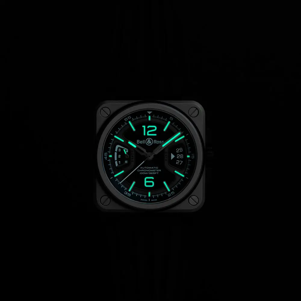 腕表搭载 与 Kenissi 合作研发的自动机芯 BR-CAL.323,通过 COSC 天文台认证,拥有 70 小时动力储备,保证精准与可靠。黑色立体表盘设有 9 点钟动力储存显示和 3 点钟日期窗口。