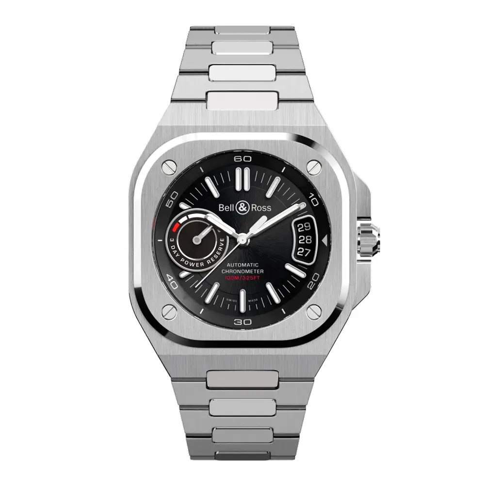 腕表搭载与 Kenissi 联合研发的 自动机芯 BR-CAL.323,提供 约70小时动力储备。配备 动力显示与日期功能,并配有 不锈钢表链与折叠扣。具备 100米防水性能,BR-X5 Black Steel 是 现代力量与瑞士精度的象征。
