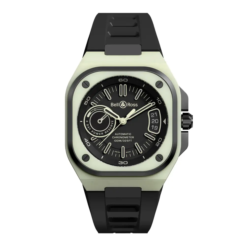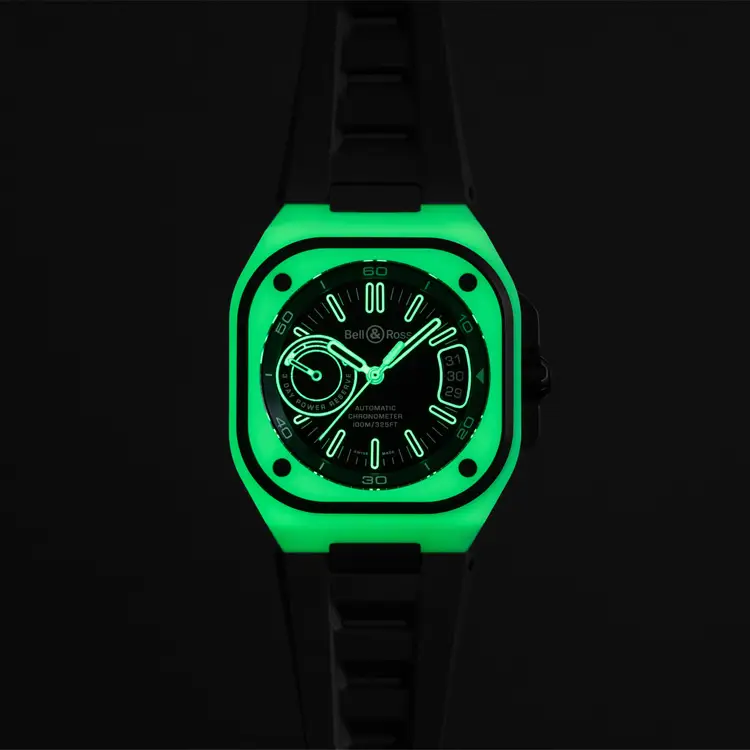 腕表搭载 自动上链机芯 BR-CAL.323,由 Kenissi 联合研发,提供 约70小时动力储存 与高精准度。黑色橡胶表带配折叠扣 突显运动风格,100米(10 bar)防水性能 保证可靠性。BR-X5 Green Lum 是一款 兼具科技与个性的杰作。