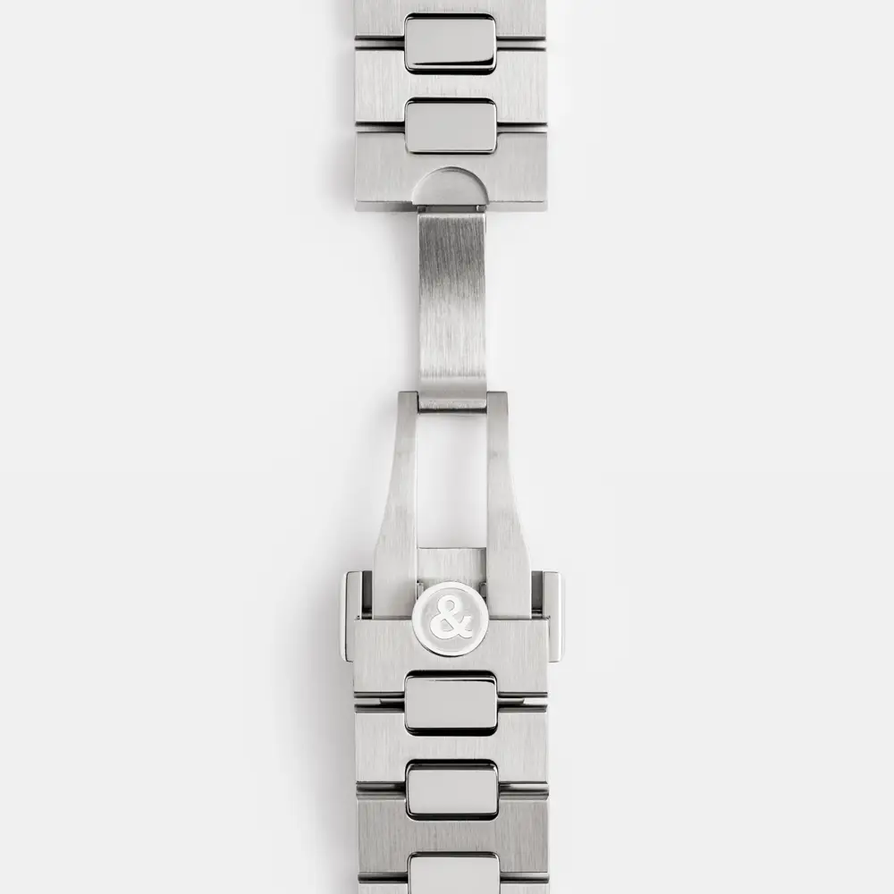 搭配 银色不锈钢表带与 折叠扣,佩戴舒适安全。10 ATM(100 米)防水性能,适合日常佩戴与轻度水上活动。