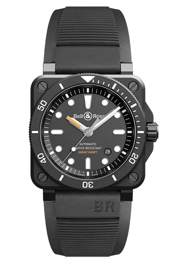 来自奢侈品牌 Bell & Ross Instruments 系列的坚固男士运动手表,防水深度达 300 米,不会让任何水上运动爱好者失望。方形表盘镶嵌在陶瓷表壳中,由蓝宝石水晶保护。月轮由黑色 PVD 精钢和黑色橡胶表带制成。
