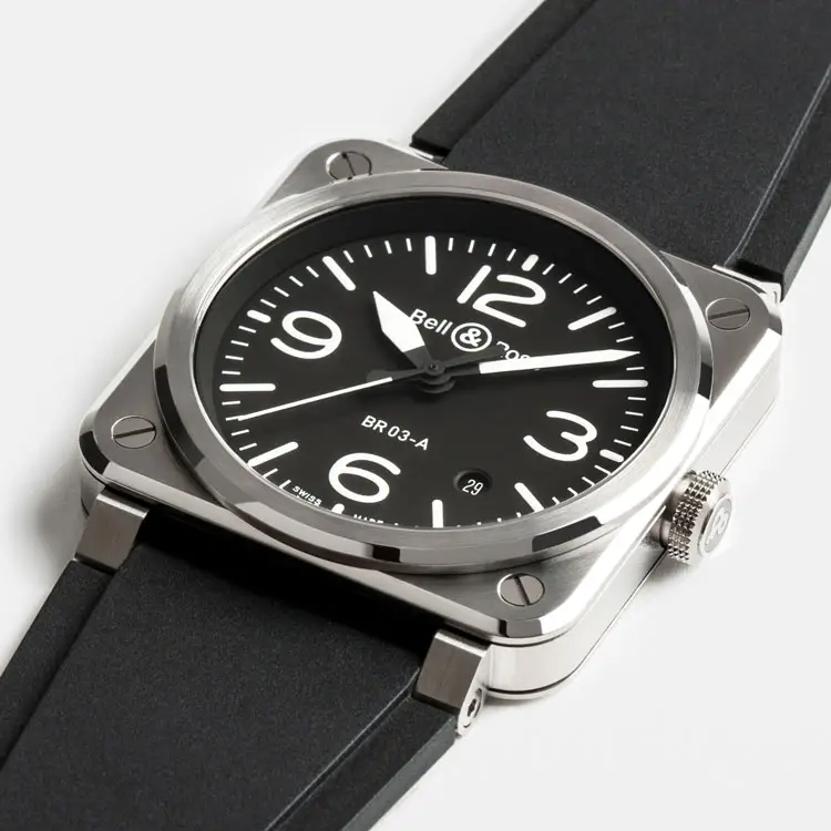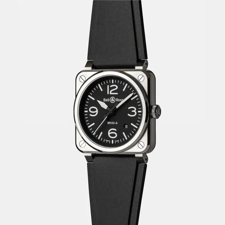 Bell & Ross的BR 03系列是航空仪表美学在手腕上的缩影。典型的方形表壳搭配圆形表盘,直接取材于军用飞机的驾驶舱面板,已成为该品牌的标志性特征。BR 03 专为技术、精准和前卫风格的爱好者设计。
