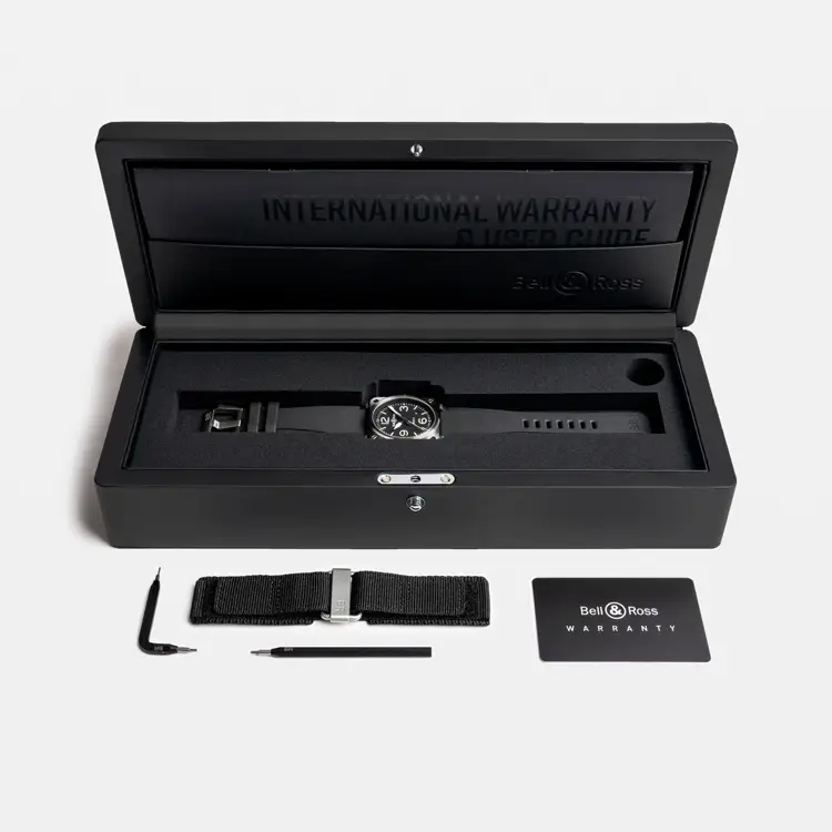 腕表搭载 自动上链机芯 BR-CAL.302,具备 约 54 小时动力储存,确保精准可靠。配备 黑色橡胶表带与针扣,并具备 100 米(10 ATM)防水性能。Bell & Ross New BR 03 Black Steel 完美融合了 专业功能、航空美学与现代优雅。