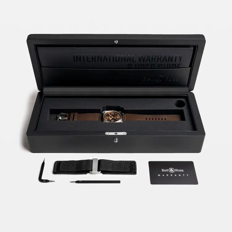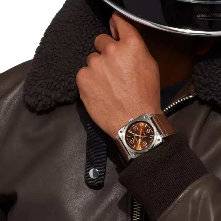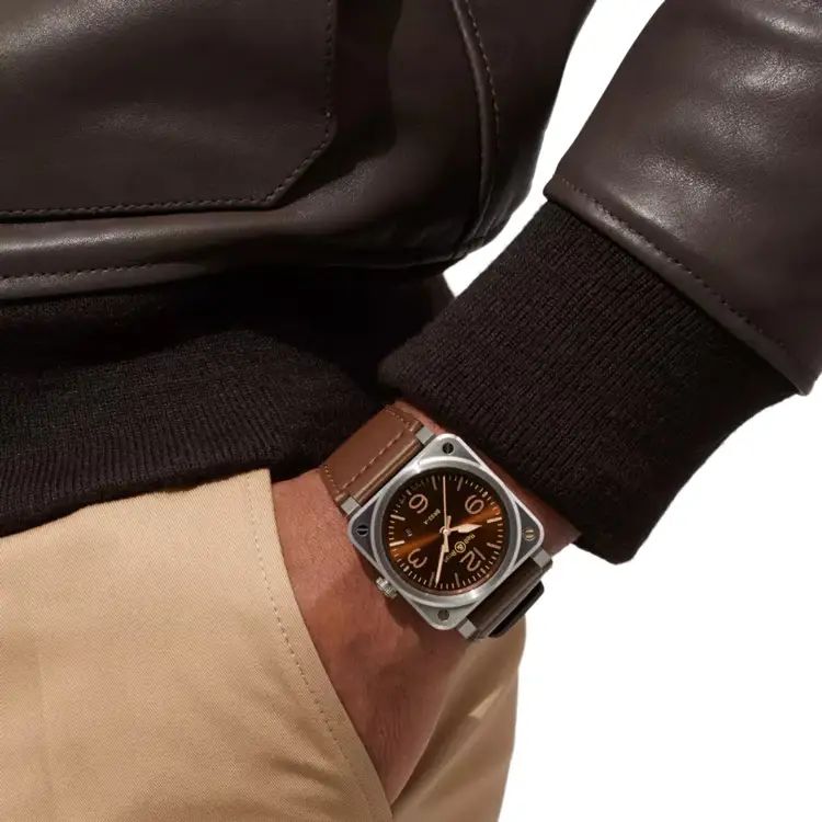 41 毫米不锈钢方形表壳展现 Bell & Ross 标志性风格。防反光蓝宝石玻璃保护着棕色指针式表盘,金色指针和刻度配有夜光涂层,确保在黑暗中依然清晰可读。