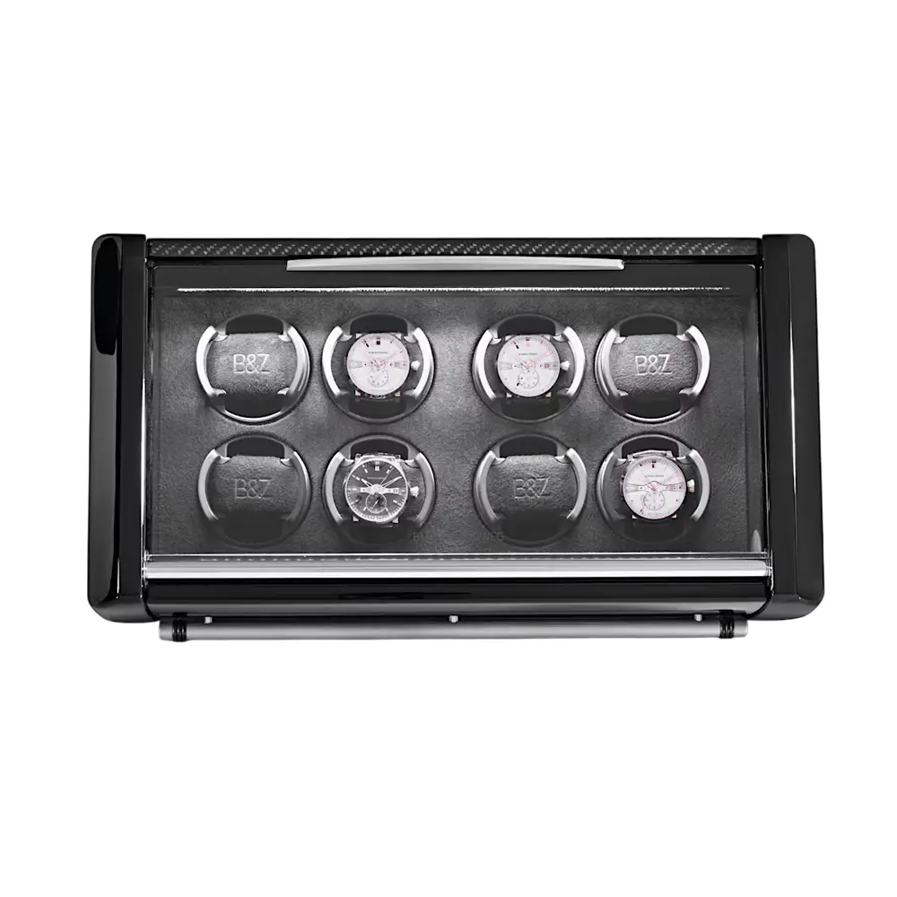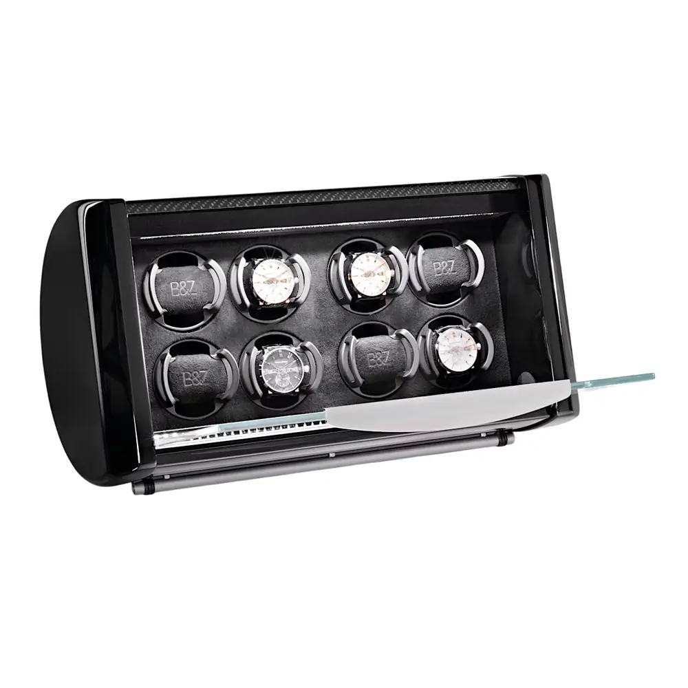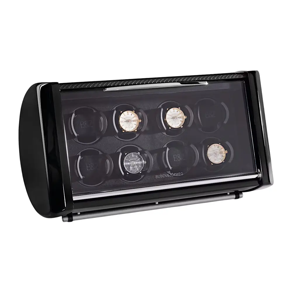 Buben & Zorweg SPIRIT 8 上链盒完美融合了奢华设计、技术精度与精湛工艺。它可容纳多达 8 枚自动腕表,采用拉丝铝制机身,配以 碳纤维、鳄鱼皮或马卡萨木 等高端细节装饰。前方安全玻璃窗让您在设备运转时仍能欣赏腕表收藏,内部柔软的天鹅绒衬里为腕表提供周全保护。