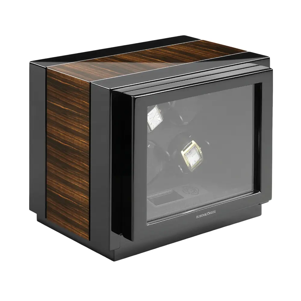 Buben & Zorweg VANTAGE 4 Macassar 上链盒完美融合了 技术精密、奢华材质与永恒设计。此款型号可容纳 四枚自动腕表,以优雅的木质外壳为基础,外层覆以高光黑色钢琴漆,并饰以异国 马卡萨木 镶嵌,形成鲜明对比,彰显产品的非凡格调。