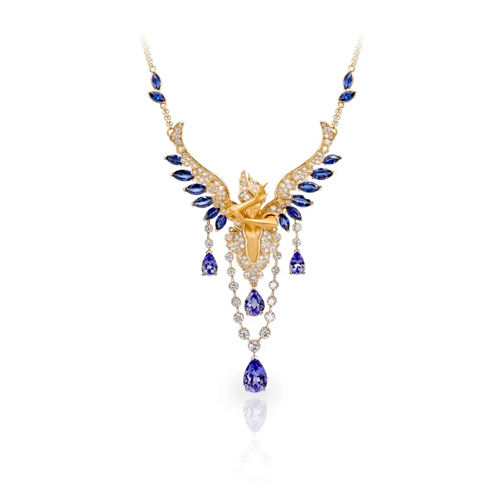 带翅膀的女神中央图案周围镶嵌着美丽的宝石。珠宝镶嵌了157 颗钻石,总重 1.87 克拉,为整个珠宝增添了璀璨的光芒和深度。总重 2.85 克拉的 4 颗坦桑石和总重 2.83 克拉的 12 颗蓝宝石呈现出奢华的蓝色调,其璀璨的光芒唤起了天堂般的能量和神圣的庄严。