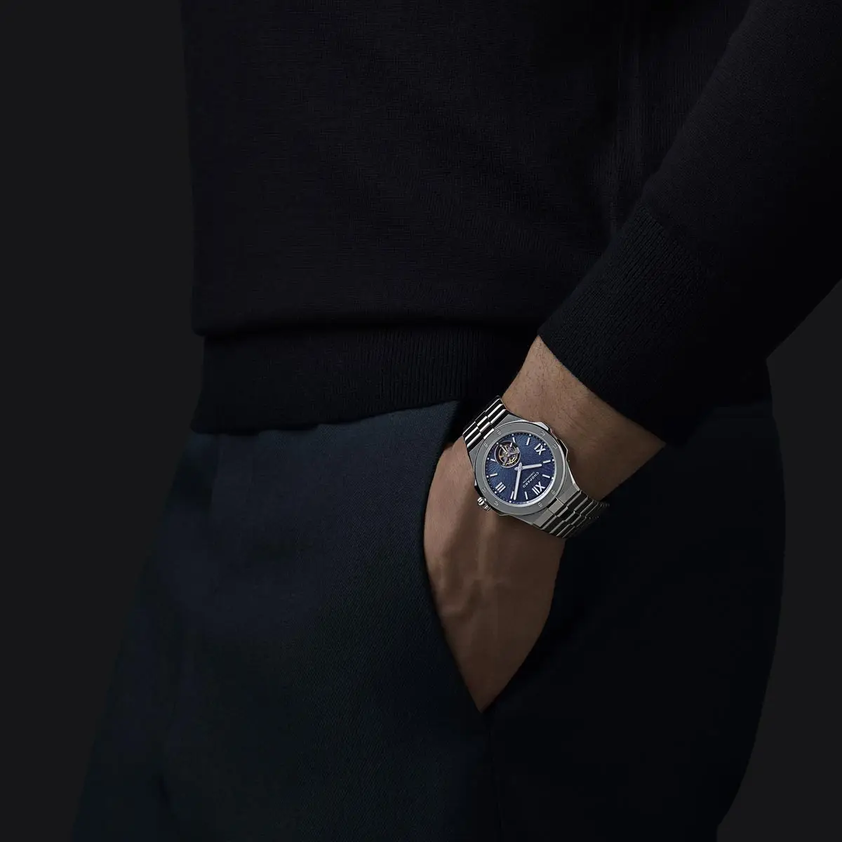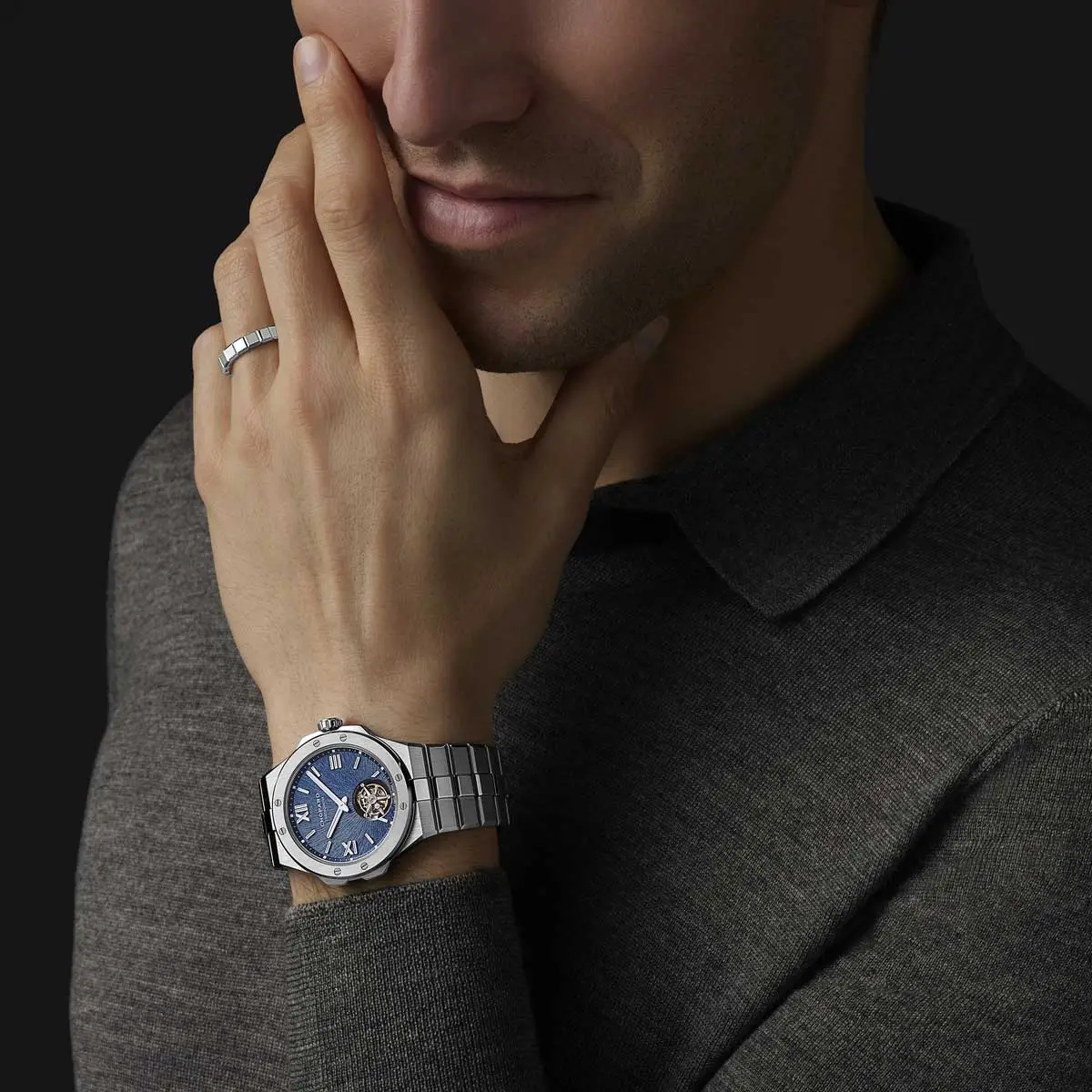 41 毫米圆形表壳展现出运动气质与经典线条的完美平衡。防眩光蓝宝石水晶镜面保护纹理如冰川湖泊的深蓝色表盘。