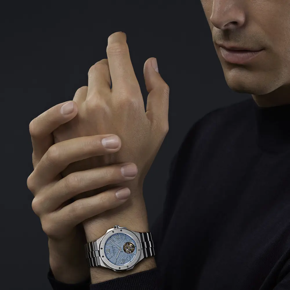 Rhône Blue 表盘采用鹰眼纹理设计,呈现丰富层次与光影效果。6点位置设有飞行陀飞轮,提升走时精准度。夜光指针与刻度保证清晰读时。