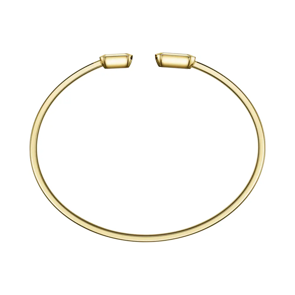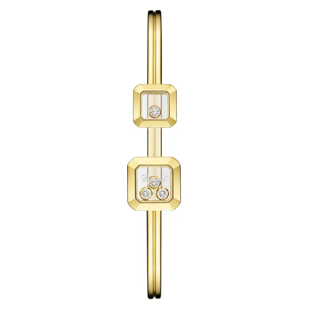 萧邦 Chopard Happy Diamonds Icons 手镯 85A114-0002 诠释了 喜悦、动感与女性优雅。由 18K 道德黄金 精心打造,散发温暖光泽。中央镶嵌 可在两片蓝宝石水晶之间自由滑动的钻石,随手腕的轻盈动作而闪耀流动——这是 Happy Diamonds 系列的标志设计,象征着自由与生活的快乐。