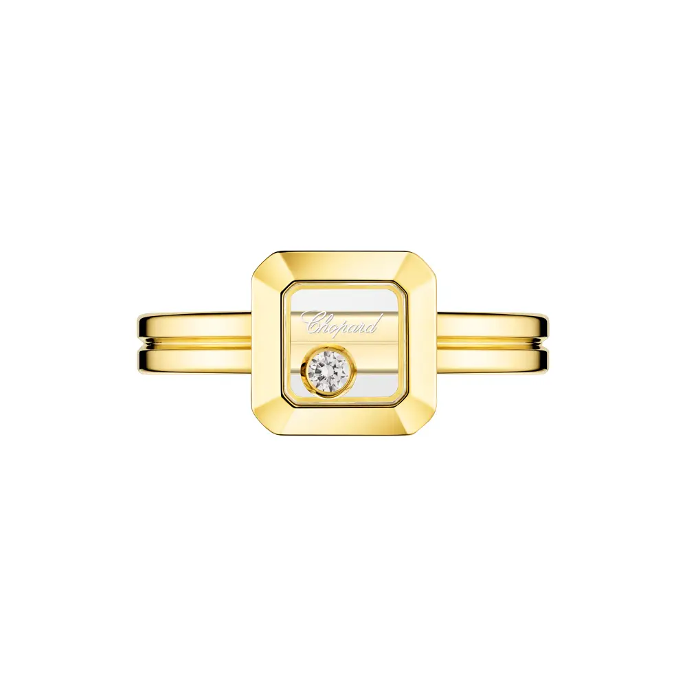 Chopard Happy Diamonds Icons 82A114‑0110 来自标志性的 Happy Diamonds 系列,是一款奢华的女士戒指,象征着自由、灵动与生活的喜悦。戒指采用 18K 黄金打造,中央镶嵌一颗 可自由滑动的明亮式切割钻石,重 0.05 克拉,被置于两片蓝宝石水晶之间,让钻石在光影中优雅“起舞”。